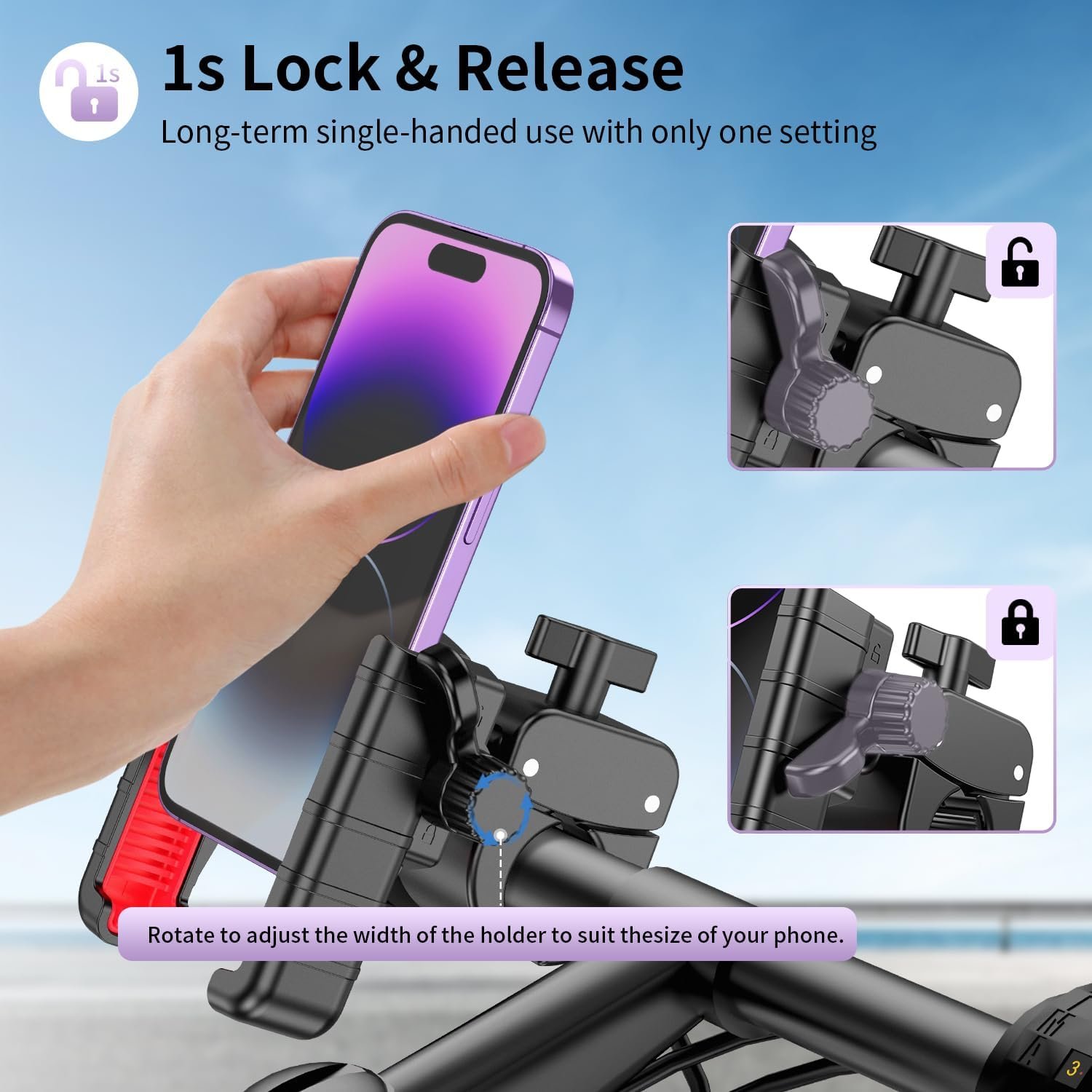 [Full Camera Access] The clever open design of the motorcycle phone holder allows full access to the phone screen controls and all buttons without blocking your face ID and fingerprint ID. Support photo shooting and video recording in cycling. You can use the mobile phone GPS function at any time. Transform into an sports camera, record and share your cycle tour