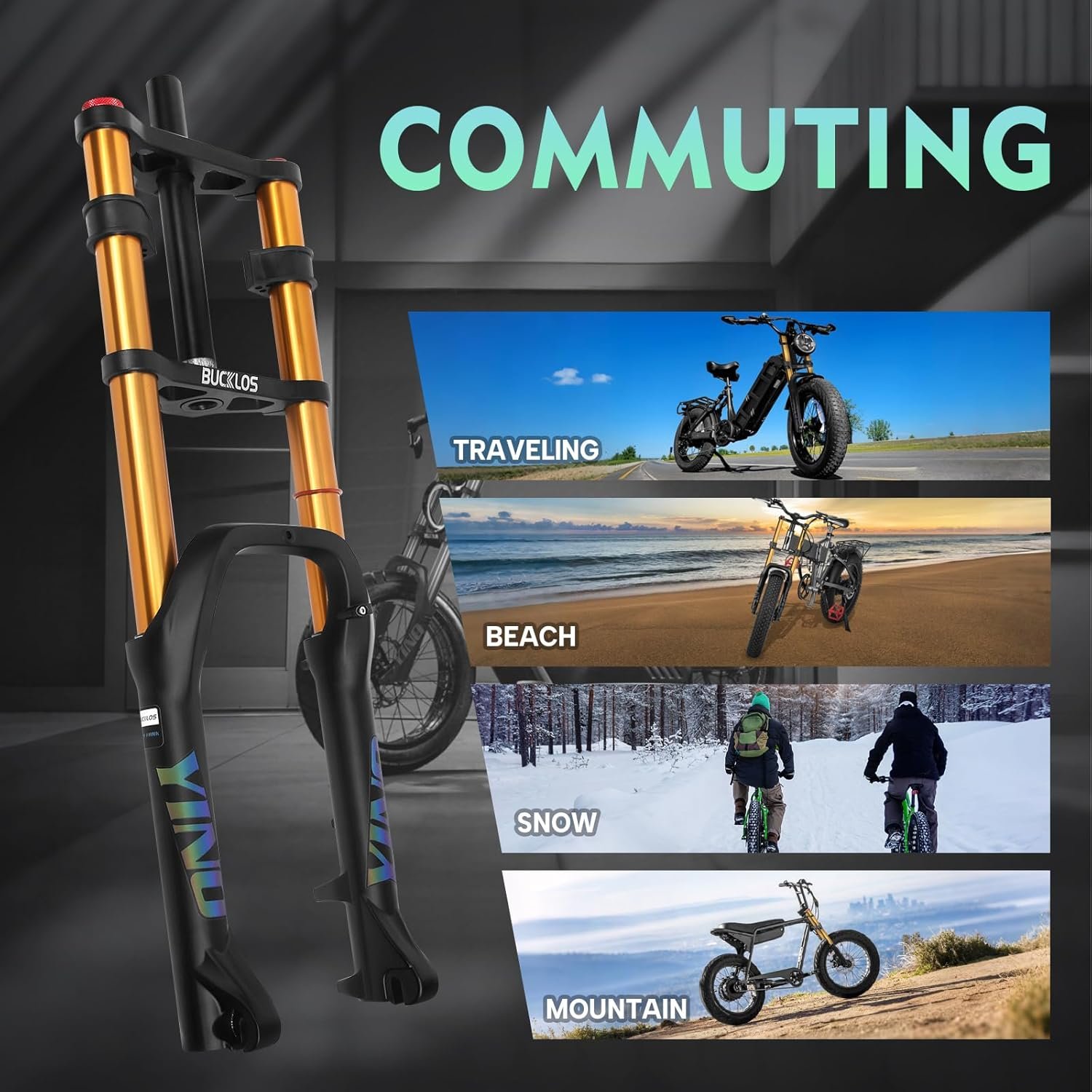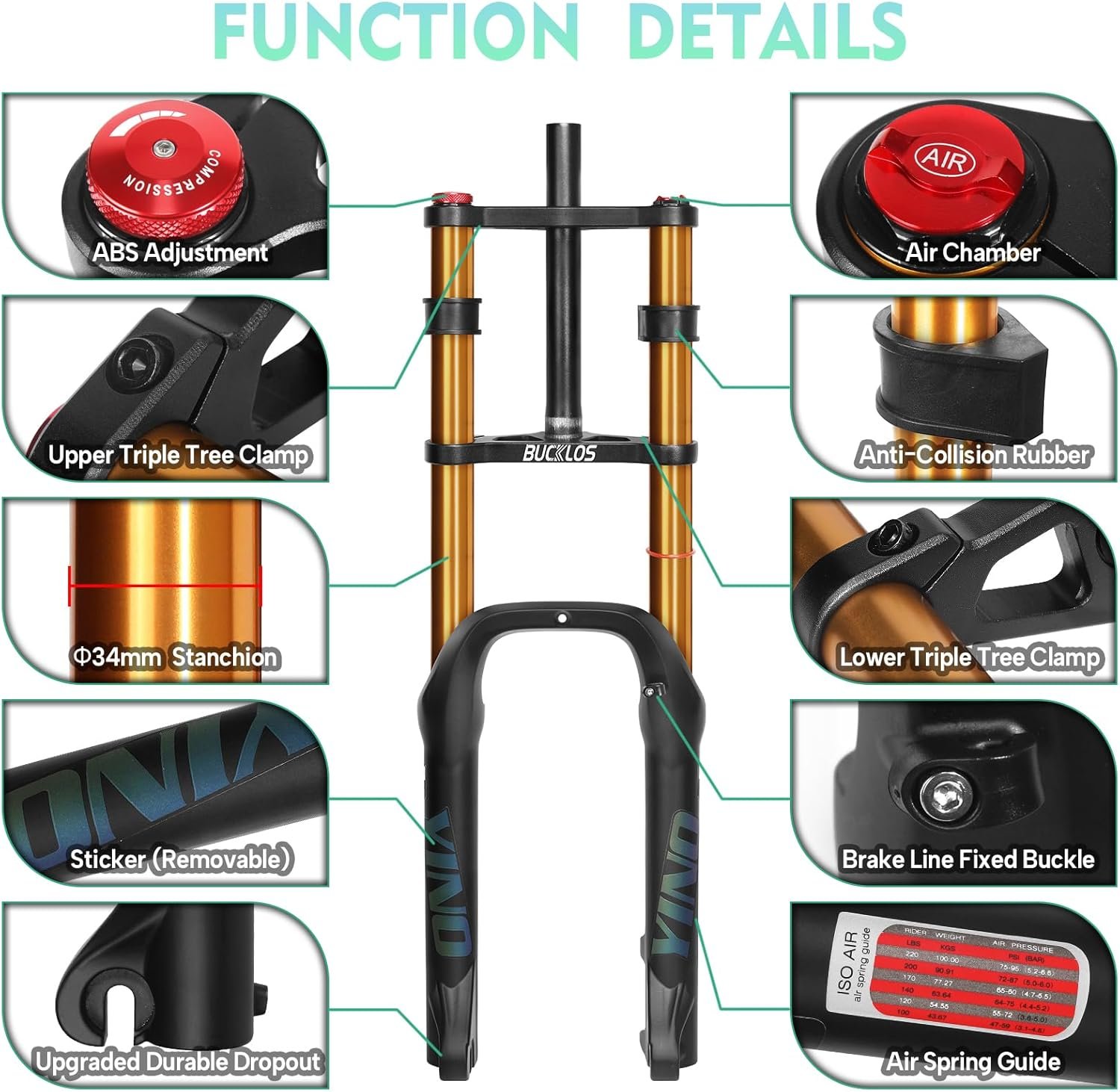 Light weight: Its weight is only about 2645g, 1.8lbs lighter than the oil spring fork (equivalent to the weight of 1 bottle of 800ml water). It minimizes the weight of the bike and allows you to play easier and faster on snow or beach