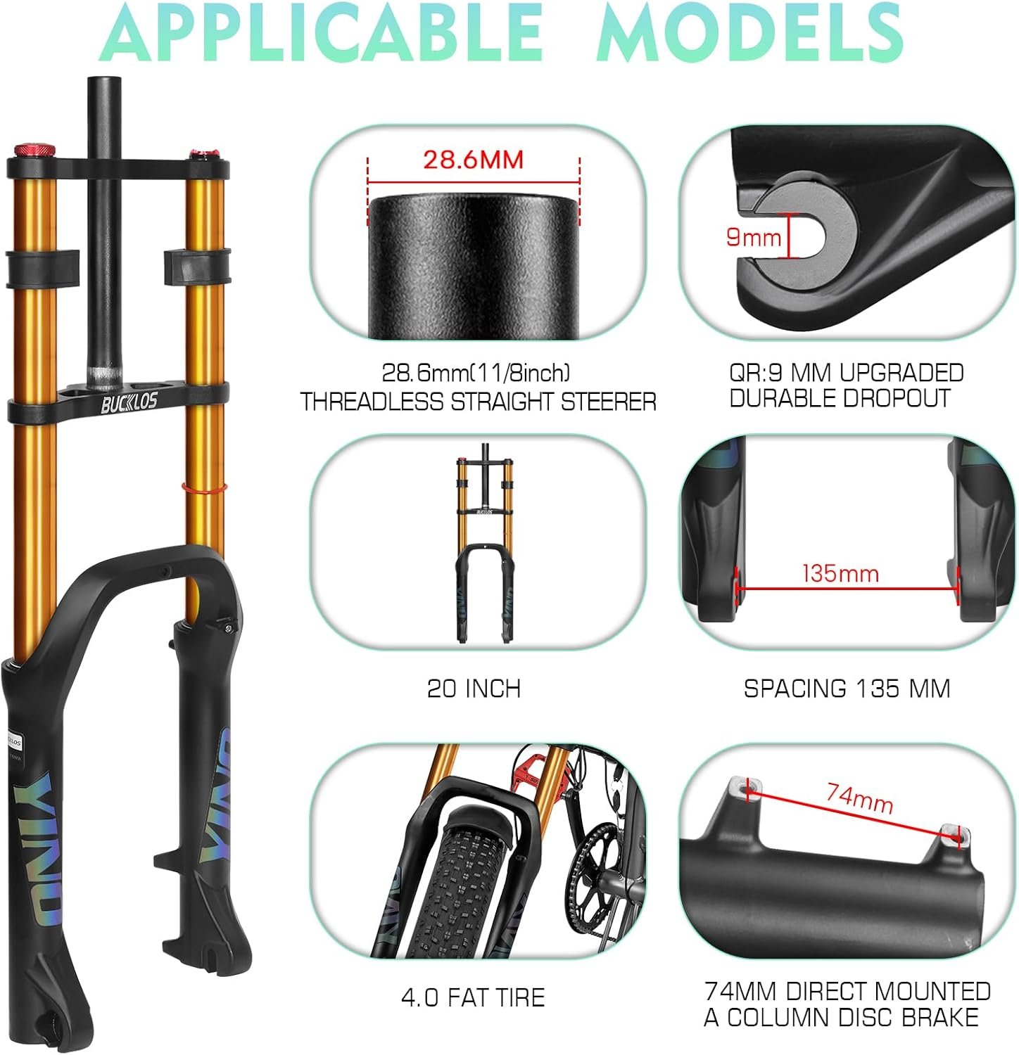 Applicable models:Suitable for most 20 inch 4.0 fat tire snow bikes、 beach bikes、 E-bikes. But the premise is that you need to carefully check your model and parameters(crown lockout,QR:9 mm*135 mm,disc brake)before placing an order