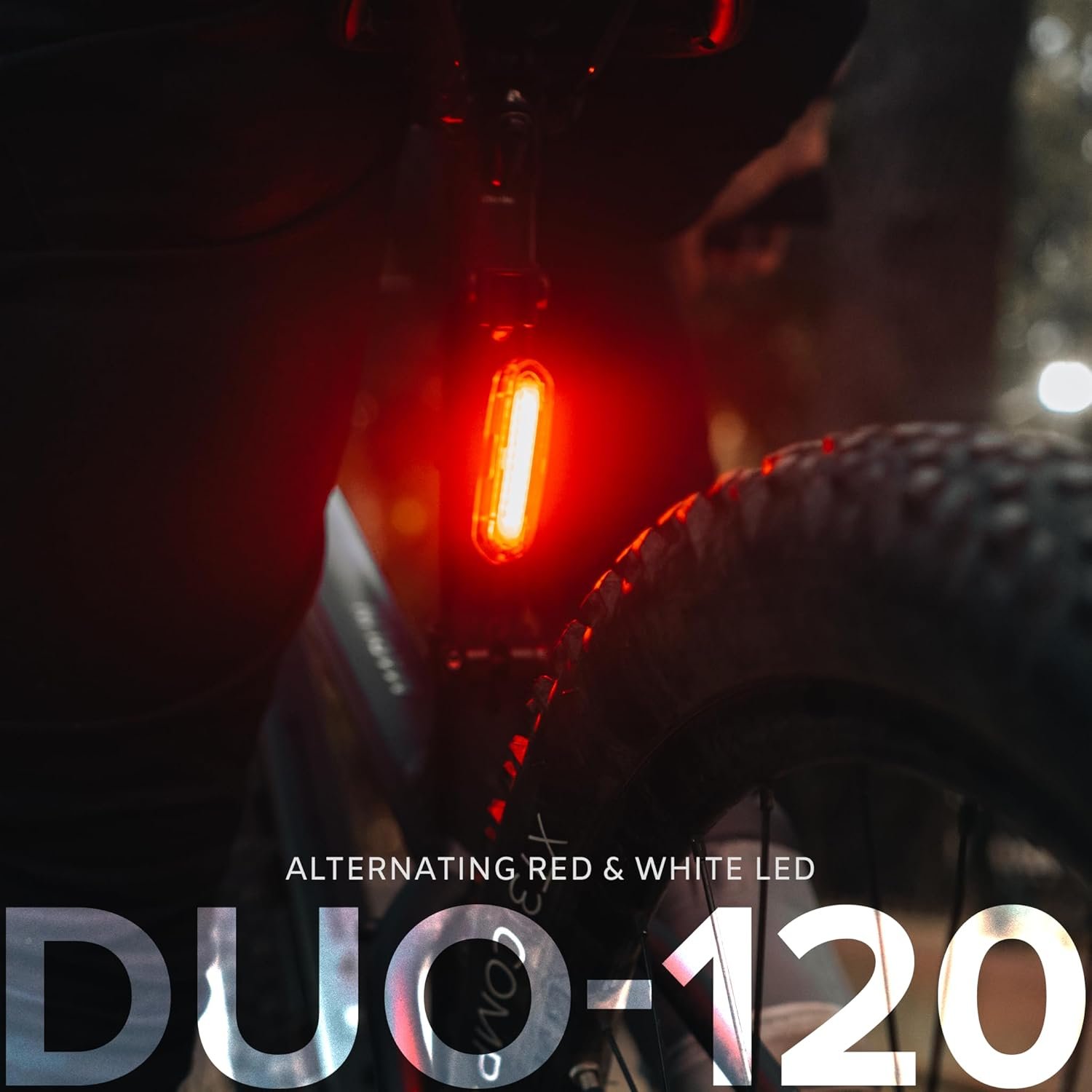 POWERFUL CREE XP-G2 LED & AMBER SIDE LIGHTS: The BX-300 headlight features a 370-lumen output with a wide-angle view for improved visibility. Amber side lights provide additional side visibility, enhancing awareness for other road users. The Duo-120 red & white LED USB rechargeable taillight offers multiple lighting modes with up to 120 lumens and 180° rear coverage.