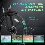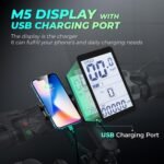 🚴𝐃𝐢𝐬𝐩𝐥𝐚𝐲 𝐰𝐢𝐭𝐡 𝐜𝐡𝐚𝐫𝐠𝐞𝐫 𝐏𝐨𝐫𝐭 & 𝐄𝐱𝐜𝐞𝐥𝐥𝐞𝐧𝐭 𝐃𝐞𝐭𝐚𝐢𝐥: The C2 electric mountain bike features 5 PAS levels, you can adjust the riding mode to suit your preferences. The M5 display is equipped with a USB port, which can fulfill your phone’s and daily charging needs. Crafted from a durable eMTB frame and a reliable 7-speed gear. Plus, its 26″x 2.0″ fat tires provide a comfortable riding experience even on rough terrain.