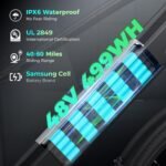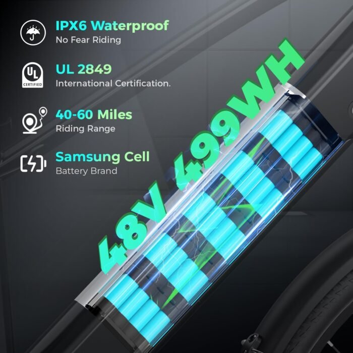 🔋𝟒𝟖𝐕 𝟒𝟗𝟗𝐖𝐇 & 𝟔𝟎 𝐌𝐢𝐥𝐞𝐬 𝐌𝐚𝐱 𝐑𝐚𝐧𝐠𝐞: Hidden removable 48V 499WH battery, which can provide longer mileage or higher power output. Furthermore, the battery of this electric bike for adults achieves an IPX6 rating, demonstrating excellent waterproof performance, and ensuring reliable operation in various complex environments.
