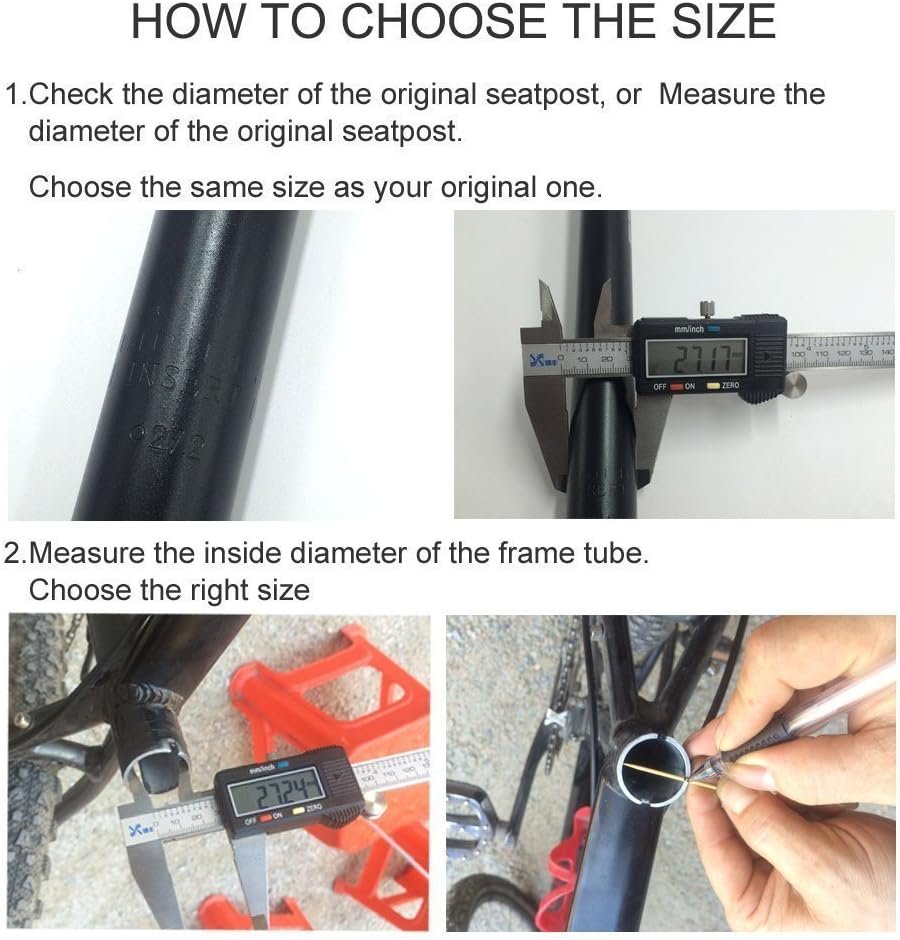 How to Choose the Size:1.Check the diameter of the original seatpost,choose the same size as the original diameter.2.Measure the inside diameter of the frame tube.