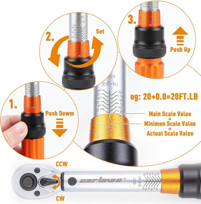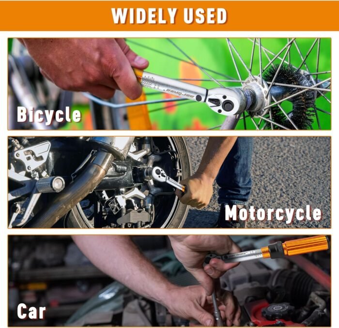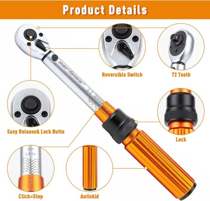 Professional Design: The torque wrench features a 1/4 drive reversible 72-tooth design, quick-release button, knurled lock ring and tailpiece, an aluminum anti-slip handle, and is equipped with an ergonomic handle design for comfortable use.