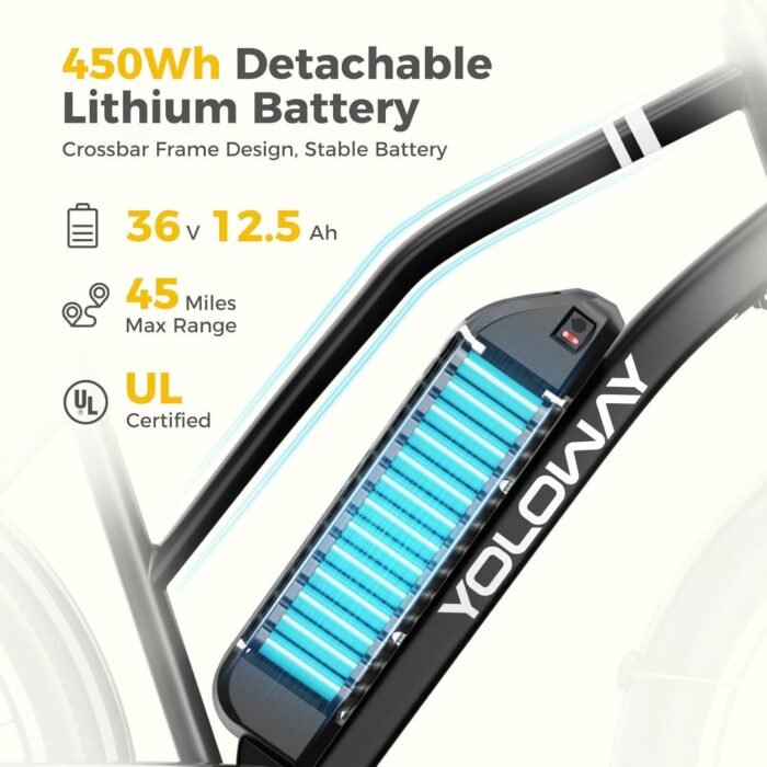LONG-LASTING JOURNEY CAPABILITY: Featuring a 36V, 12.5 Ah removable battery with a total capacity of 450 Wh, a single charge ensures a maximum driving range of 45 miles. Rigorously tested, the battery boasts stable performance and long-lasting endurance, meeting your daily commuting and short-trip needs.