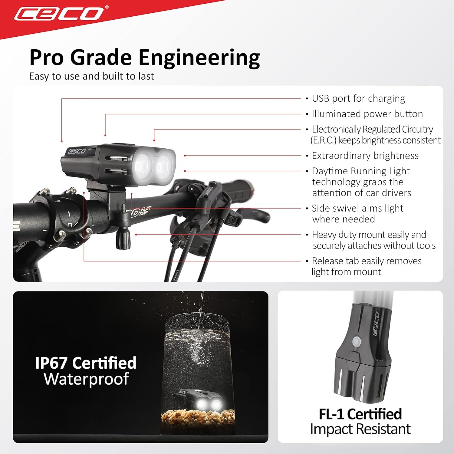 SECURE AND EASY MOUNTING – Strong and secure Zytel hard plastic material based mount attaches fast and easily on handlebars up to 32mm diameter. It swivels left and right to aim the light where needed and uses a quick release function to separate the light from the mount for use as a flashlight or when not in use.