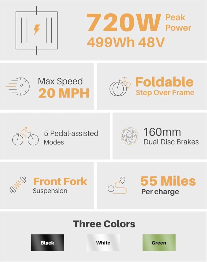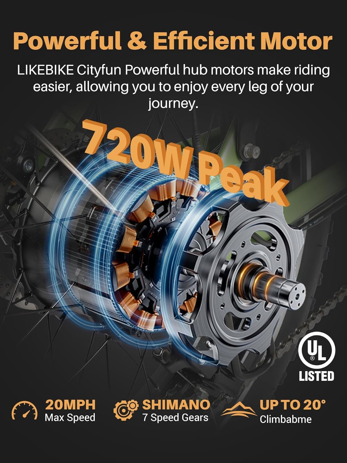 Powerful Riding Performance: Likebike Cityfun Folding Electric Bike for Adults is powered by 500W(Peak 720W) brushless motor with max speed of 20MPH. Explore 3 riding modes for a fulfilling journey! Effortlessly cruise, exercise, or commute seamlessly – we have you covered. Select Pure Electric Mode, Pedal-Assist Mode, or ride like a normal bike, tailoring your mode to match the purpose of your journey. Our e-bikes have UL 2849 Certified.