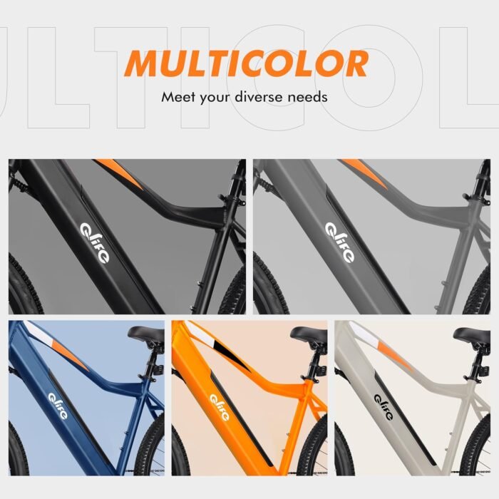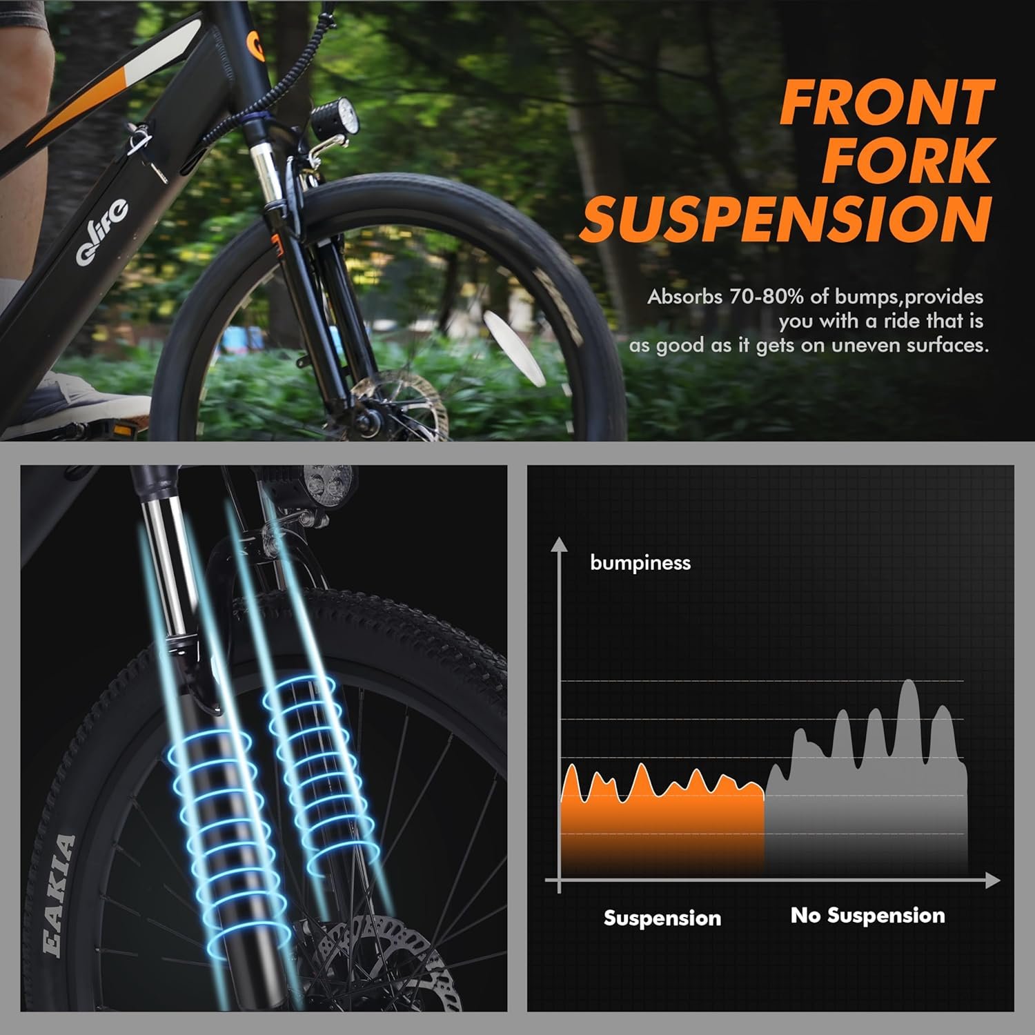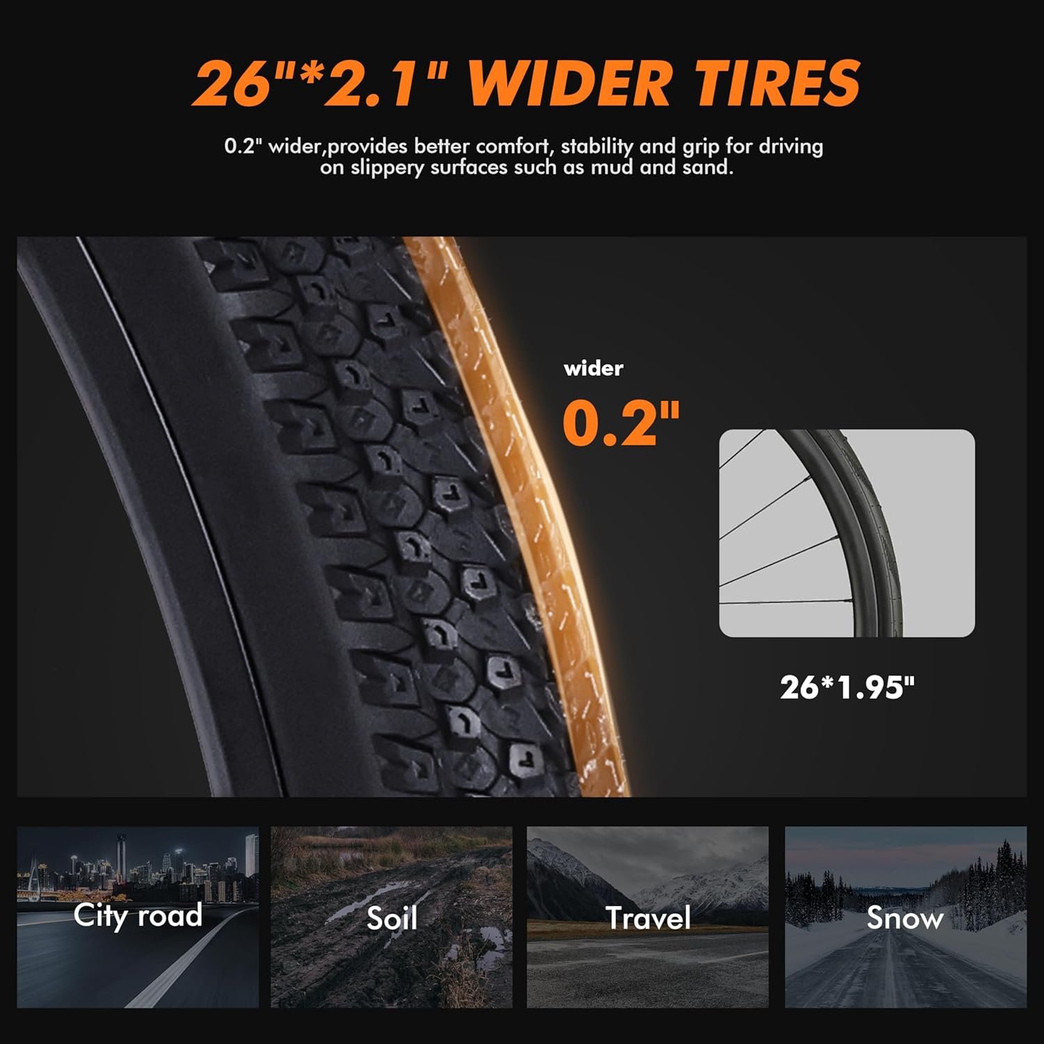 0.2″ Wider Tires Bike: The electric bike comes with 26″ x 2.1″ tires, which offer better comfort, stability, and grip compared to standard 1.95″ tires, making it suitable for driving on slippery surfaces such as mud and sand.