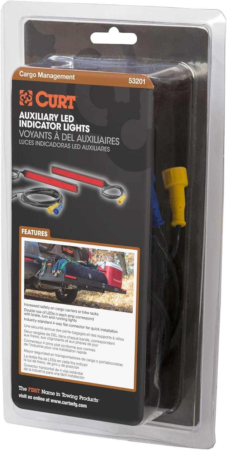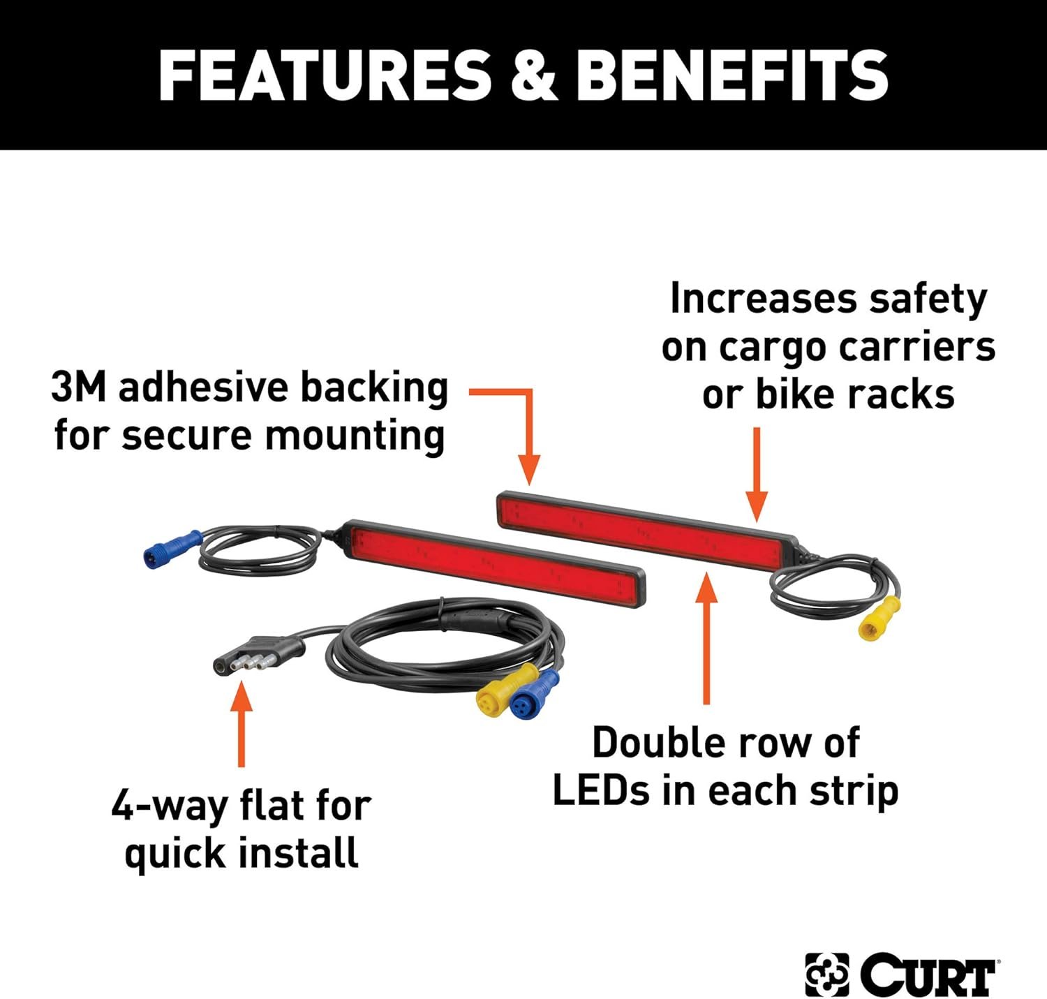 CURT auxiliary LED indicator lights add extra safety and visibility to your vehicle when towing a cargo carrier, bike rack or other hitch-mounted accessory. Simply stick them on, using the included 3M adhesive backing. These LED cargo carrier lights easily plug into your vehicle’s standard 4-flat connector and synchronize with the taillights, brake lights and turn signals. CURT LED indicator lights are constructed to be durable and waterproof to long outlast the elements.