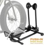 SIMPLE PUSH-IN DESIGN – This bike stand floor rack provides a versatile and convenient solution for storing bikes, accommodating wheel sizes from 20″ to 29″, including 700c wheels with a max. tire width of 2.4″. Using this bicycle storage rack is effortless—simply push your bike into the rack, and the front holder will tilt to securely hold your bike in place. The innovative design is ideal for storing a wide range of bikes, including road bikes, mountain bikes, kids’ bikes, and beach cruisers.