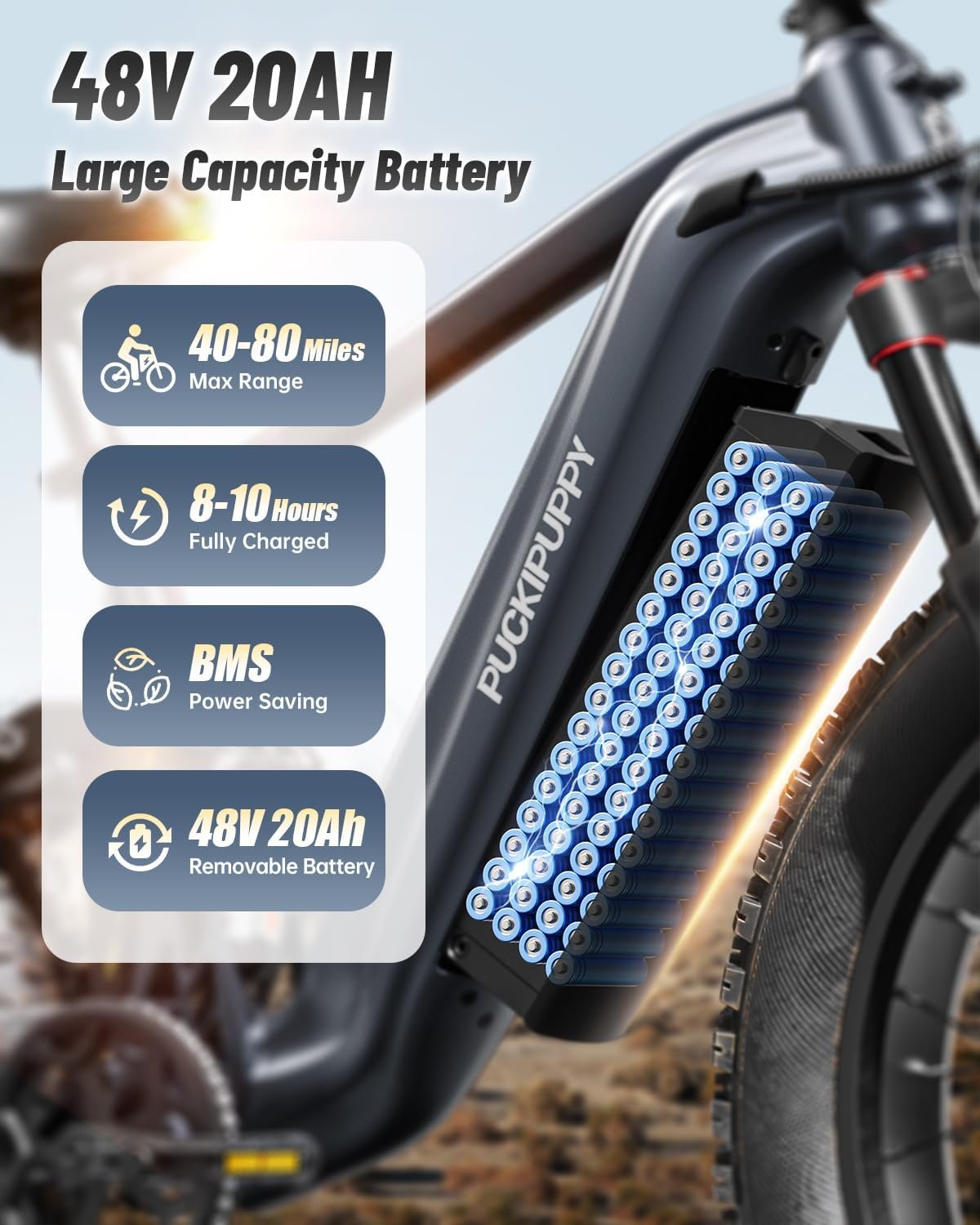 48V 20AH Removable Battery: Waterproof hidden battery design, fully charged in 8-9 hrs, up to 40-80 miles max range in pedal assist mode. (Note: the range varies depending on different road conditions, riding modes, weather, rider weight, etc.)