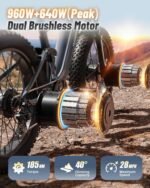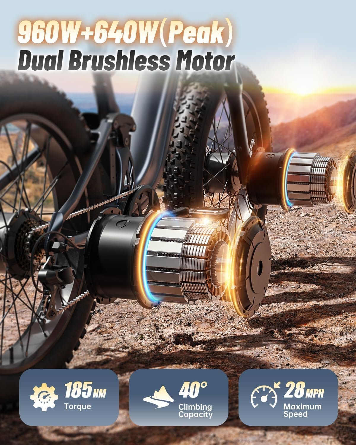 1600W Peak Brushless Motor & 28MPH Top Speed: PUCKIPUPPY Golden Retriever electric bike adopts 1600W high-speed brushless Dual hub motor (Peak 1600W/Dual motor)and with 185Nm of torque, it can provides strong climbing ability while reducing speed decay, greatly enhancing the riding experience. (up to 40°Maximum climbing ability) . Top speed up to 28MPH in pedal assist mode, 20MPH in pure electric throttle mode