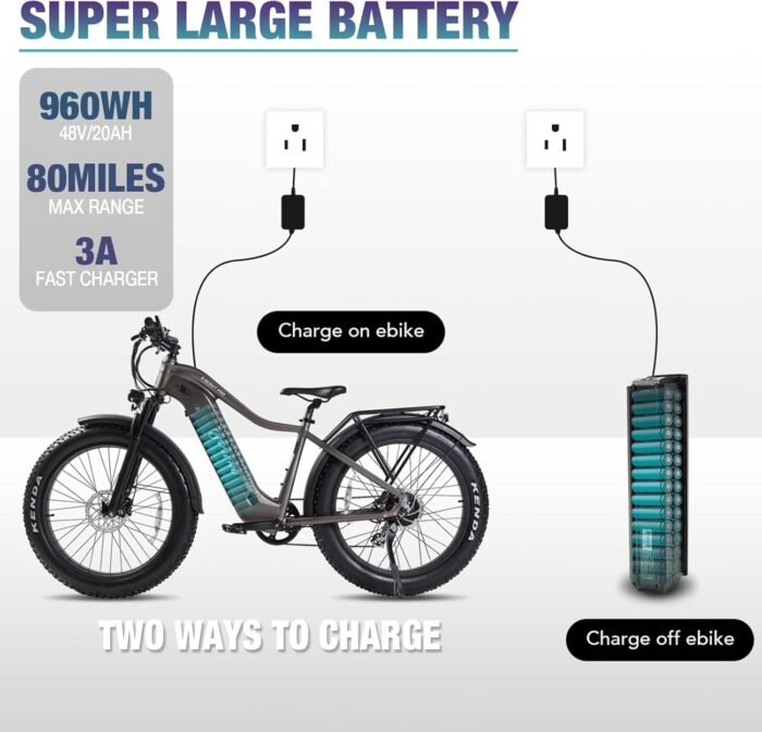 SUPER LARGE-CAPACITY BATTERY: 48V/20Ah 960Wh battery brings you up to 80 miles per full charge. The removable battery can be charged directly in the bike frame or taken off to charge. Equipped with 3A fast charger. Our battery is tested to be 10% more efficient than normal batteries after 1000 cycles.