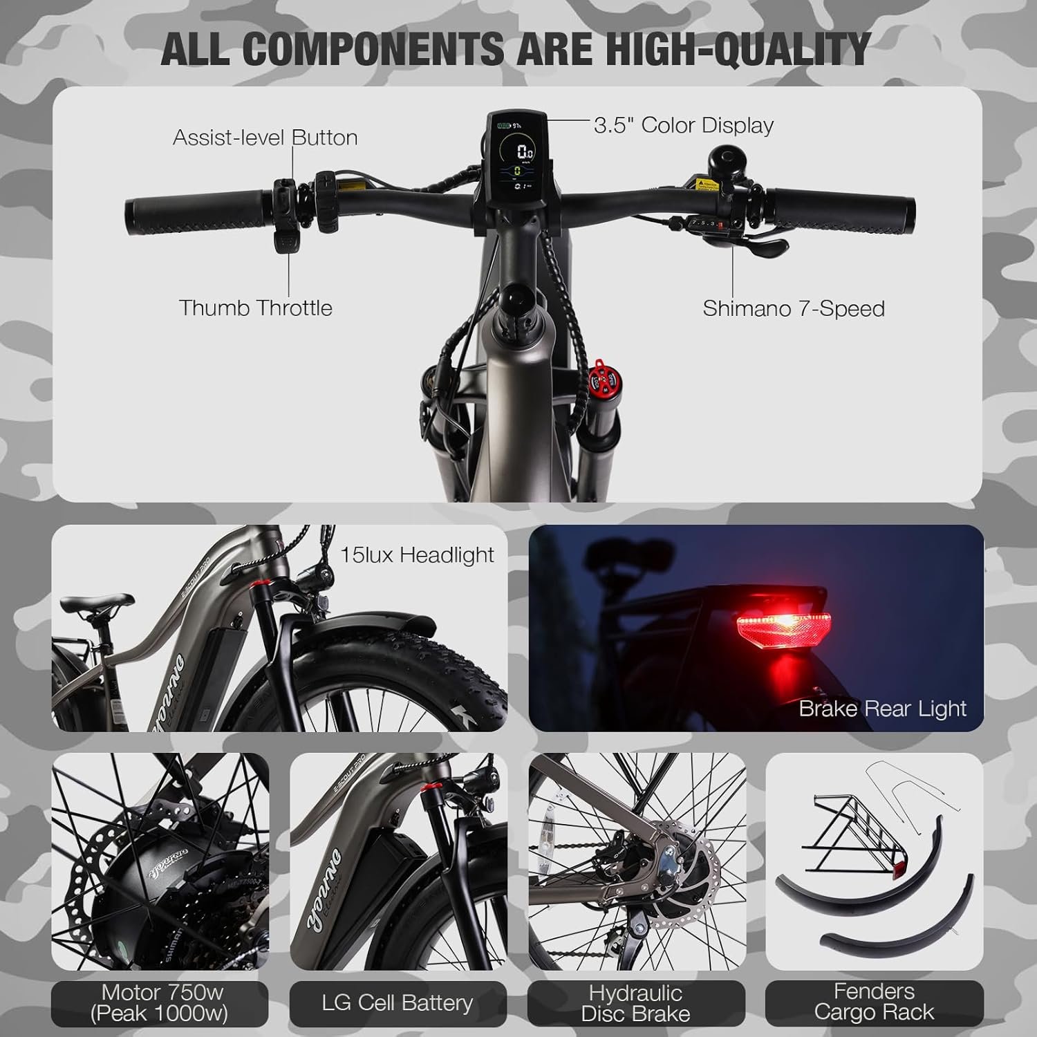 PRACTICAL & SAFE: The middle 3.5″ color display is convenient for checking speed and battery. The left handlebar integrates assist-level button, headlight switch, thumb throttle. The right handlebar integrates 7-speed shifter lever and bell. The rear light and 15lux headlight make riding safer. Equipped with dual fenders and the rear rack allows you to carry more things on trips or commute. IPX5 water-resistant, suitable for hunting in inclement weather.