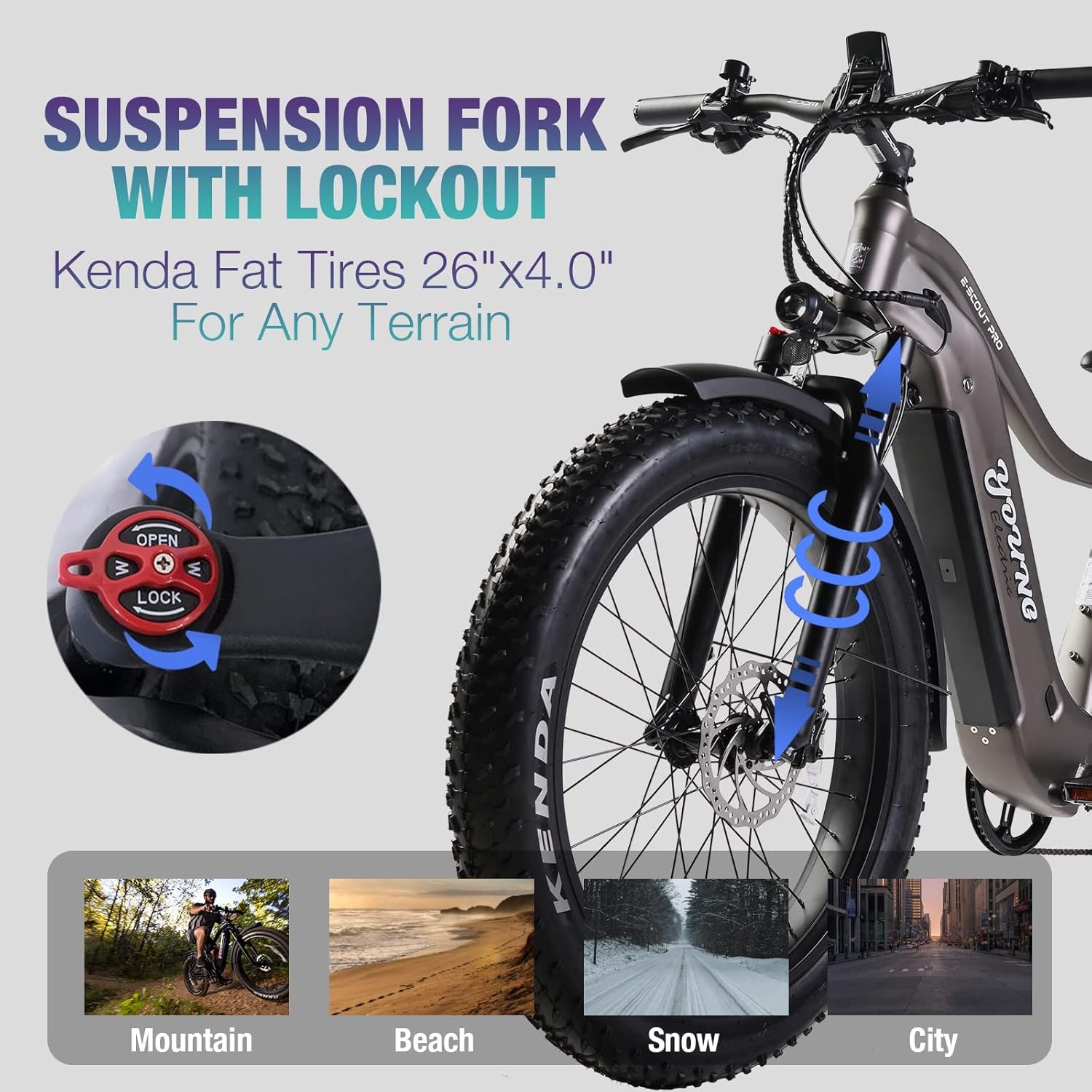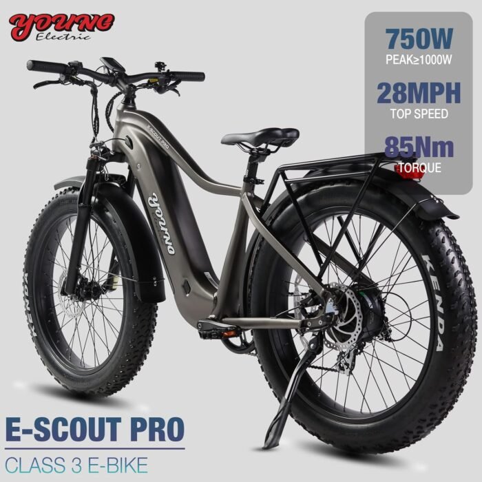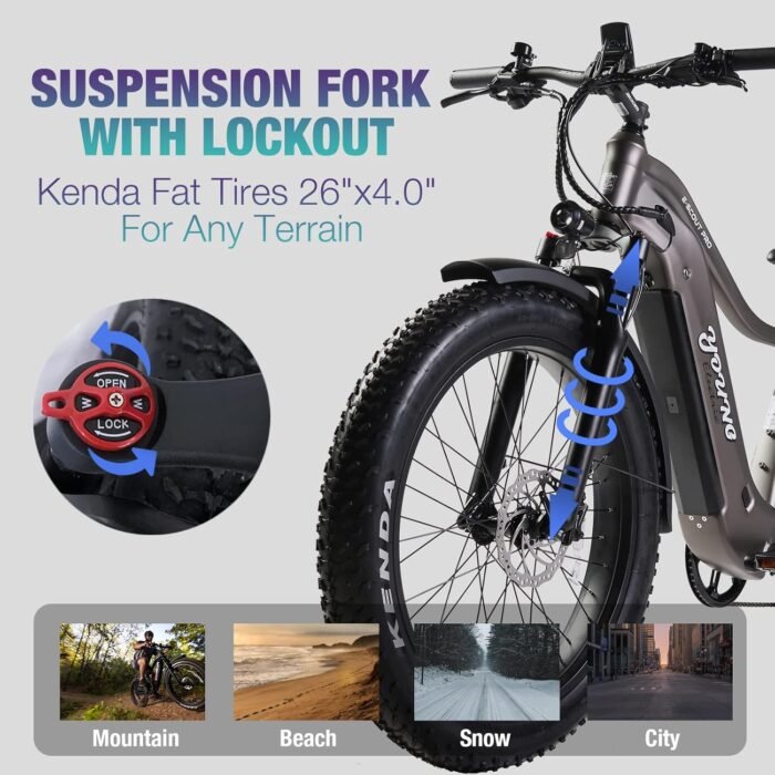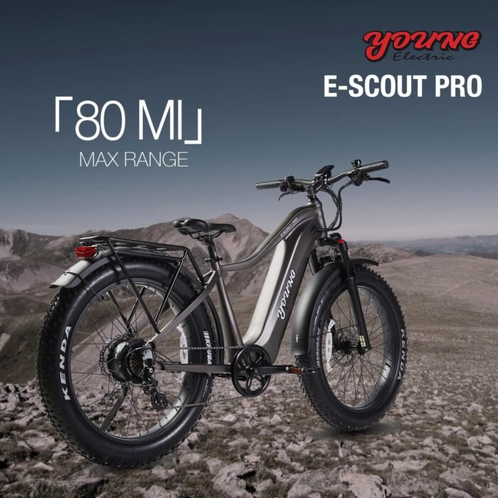 HIGH SPORTS PERFORMANCE: 750W motor with 85Nm torque, 26″x4.0″ anti-slip fat tires, suspension fork with lockout, dual hydraulic disc brakes, hydro-formed 6061 high-strength aluminum frame, all these can take you to deal with various terrains, including mountain, beach, snow, city roads. One E-Scout Pro is all you need for an unforgettable adventure.