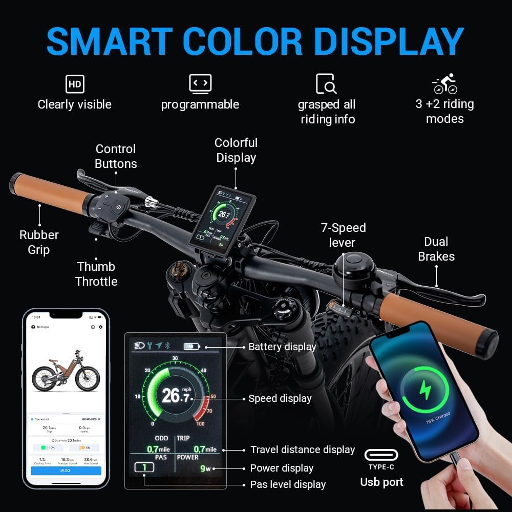 【⚙️𝐈𝐧𝐭𝐞𝐥𝐥𝐢𝐠𝐞𝐧𝐭 𝐑𝐢𝐝𝐢𝐧𝐠 𝐃𝐞𝐬𝐢𝐠𝐧⚙️】 eAhora P5 Plus electric mountain bike for adults with Colorful LCD intelligent display, it can record your every ride information and has 5 riding modes (Electric Mode, Pedal-assist Mode, Cruise Mode, Manual Mode, Walk Mode). The electric bike will be a better choice for traveling, off-roading, and commuting.