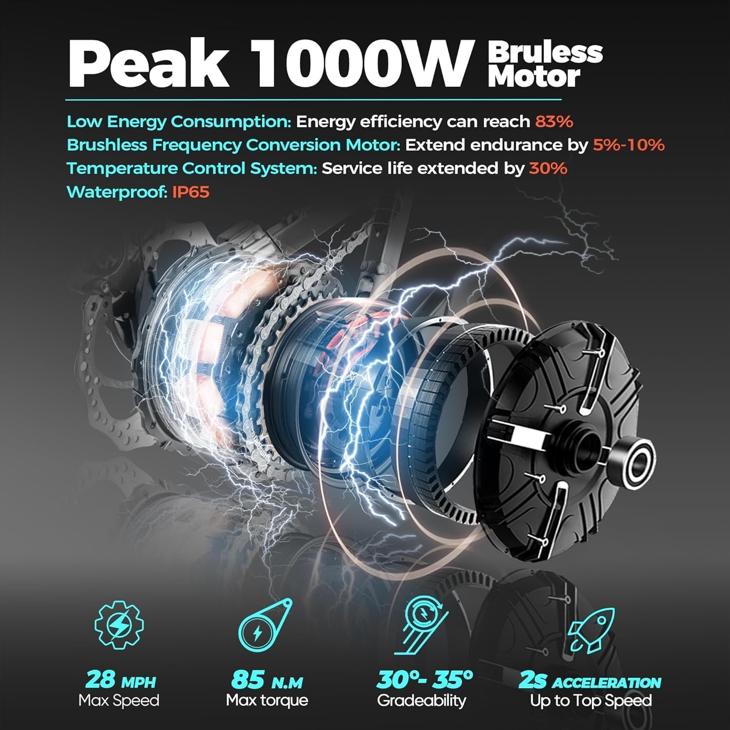 【🚀𝐏𝐞𝐚𝐤 𝟏𝟎𝟎𝟎𝐖 𝐏𝐨𝐰𝐞𝐫𝐟𝐮𝐥 𝐌𝐨𝐭𝐨𝐫🚀】eAhora P5 Plus Peak 1000W electric bike motor(standard 750W)guarantees a strong, efficient ride. Feel the thrill of acceleration with a 28-32 MPH top speed. Boasting 85N.M of torque, it conquers rough terrain with ease. It is a reliable companion for any adventure, whether you’re commuting to work or exploring new horizons.