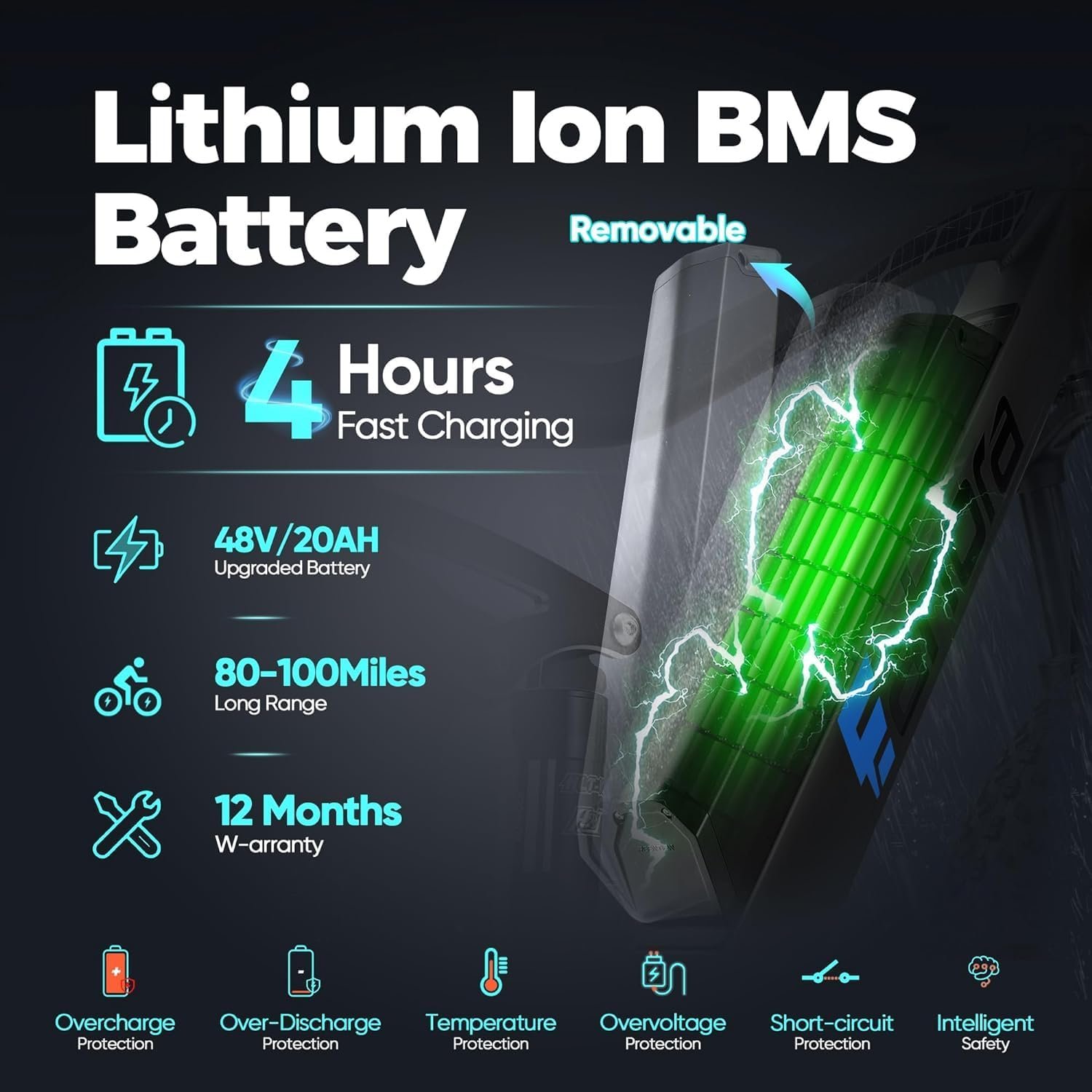 【🔋𝐁𝐮𝐢𝐥𝐭-𝐢𝐧 𝐁𝐌𝐒 𝐅𝐚𝐬𝐭-𝐜𝐡𝐚𝐫𝐠𝐢𝐧𝐠 𝐁𝐚𝐭𝐭𝐞𝐫𝐲🔋】eAhora P5 Plus adult electric bike has the upgraded 48V 20AH Removable battery and built-in BMS providing automotive grade protection. 4 hours fast charging can get your battery to 80%+. You can ride it around the city for 80 miles in PAS mode. It will allow you to safely ride longer distances in less charging time.