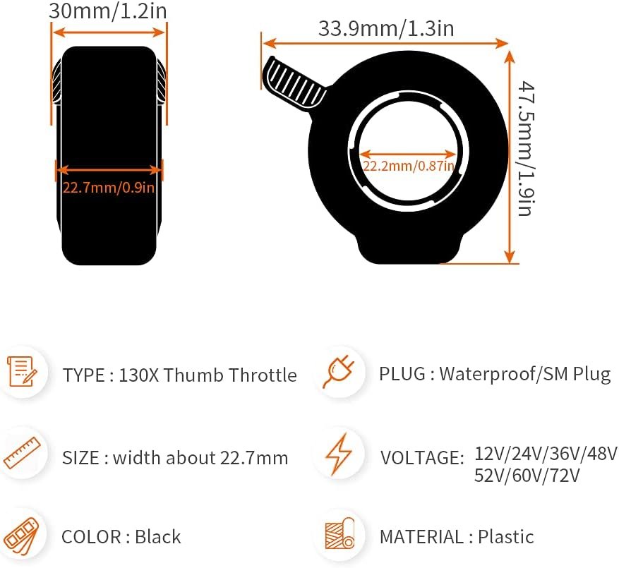 Type: 130X Thumb Throttle Voltage: 24V, 36V, 48V, 60V, 72V Cord length: 180cm(SM) 28cm(Waterproof) Plug: 3-pin connector Applicable handlebar diameter: Approx. 22.5mm/0.88in Installation position: left handle or right handle Weight: 65G