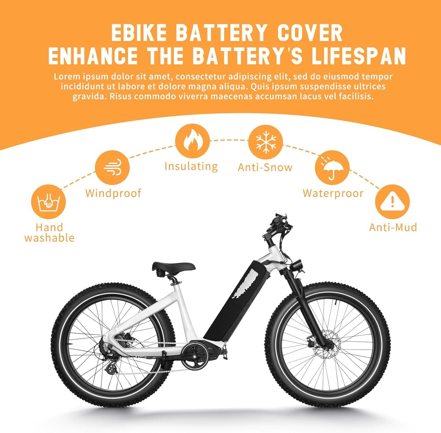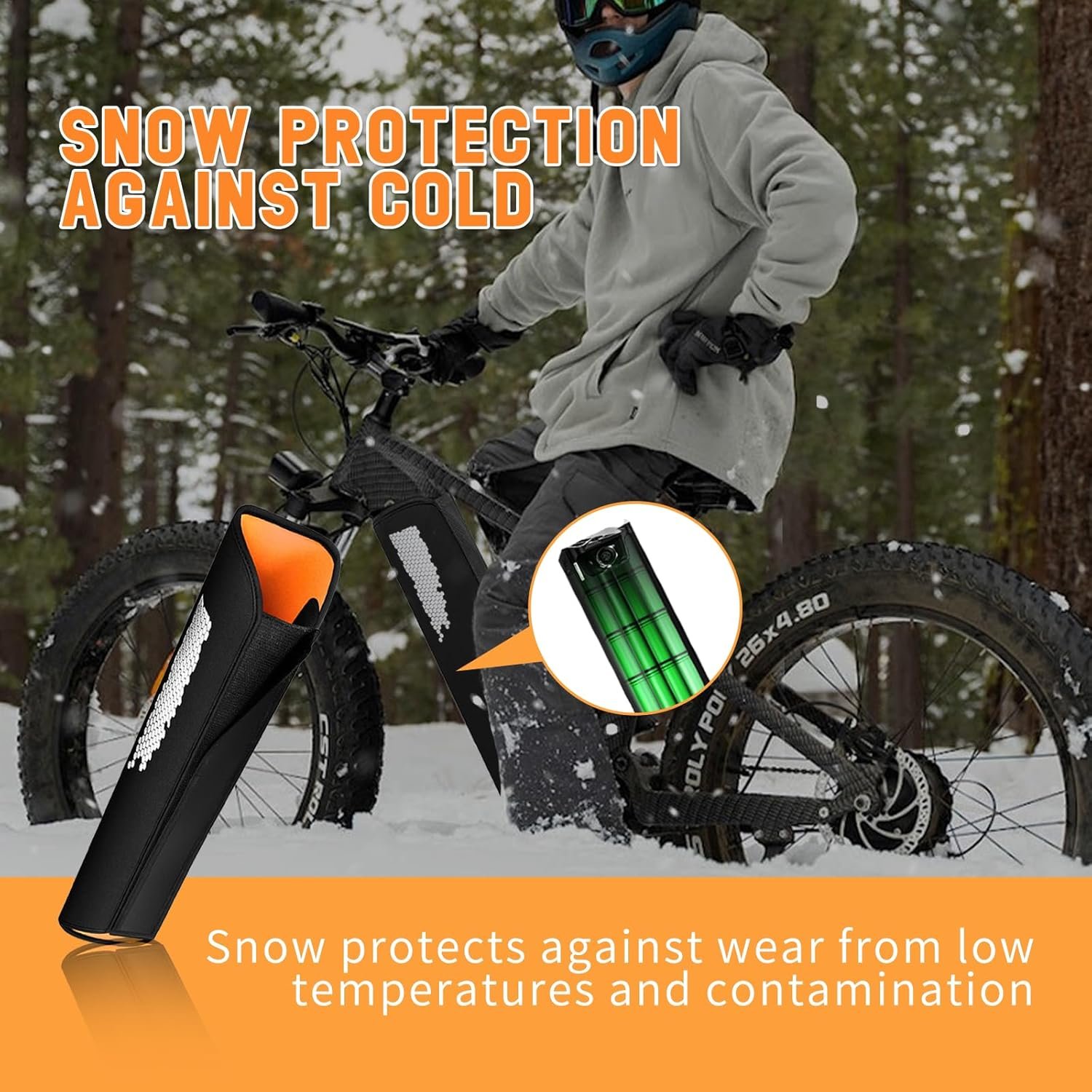 Extending Battery Life – E-Bike Battery Protective Cover will safeguard your battery and extend its lifespan. It is known that the battery is the heart of an e-bike, and its longevity is crucial. Prolonged exposure to low temperatures can shorten the battery’s lifespan. We strongly recommend using our e-bike battery case to cover your battery when temperatures drop below 15 degrees.