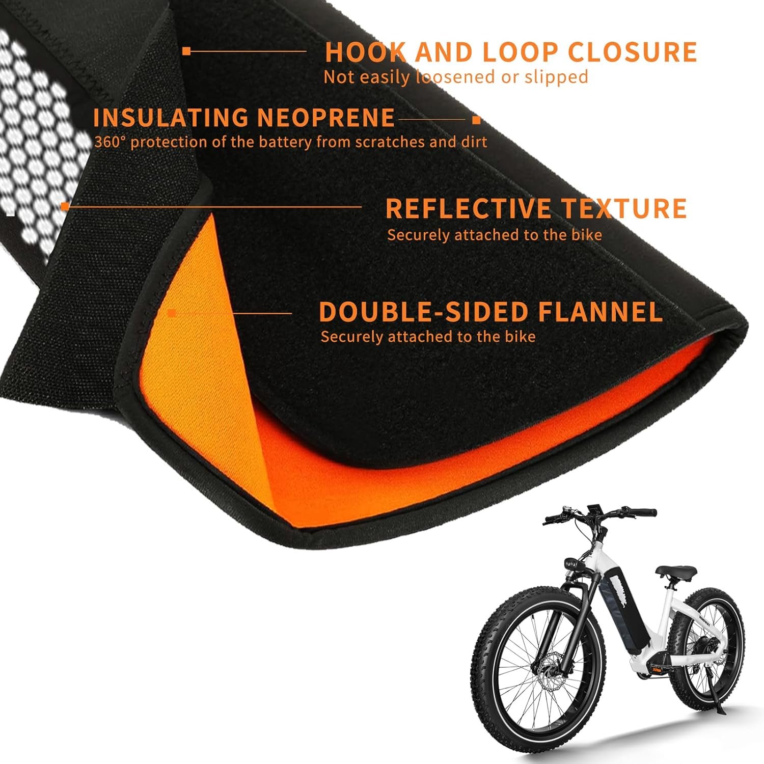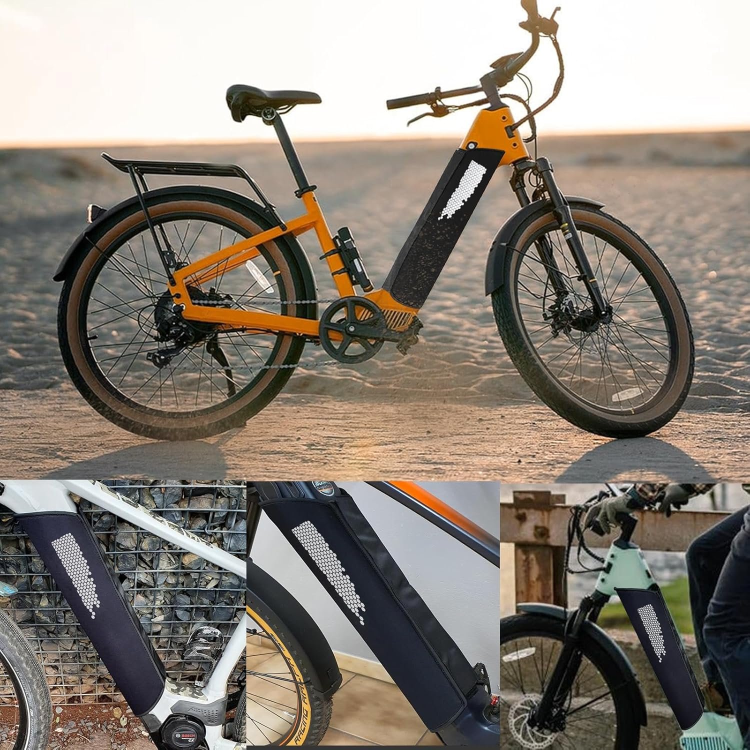 Simply slip the ebike frame cover over your battery, and you’re good to go. Our ebike frame battery cover, with its nylon hook and loop fastener design, fits snugly over your battery and is easy to install and remove, making it a convenient accessory for any E-Bike owner.