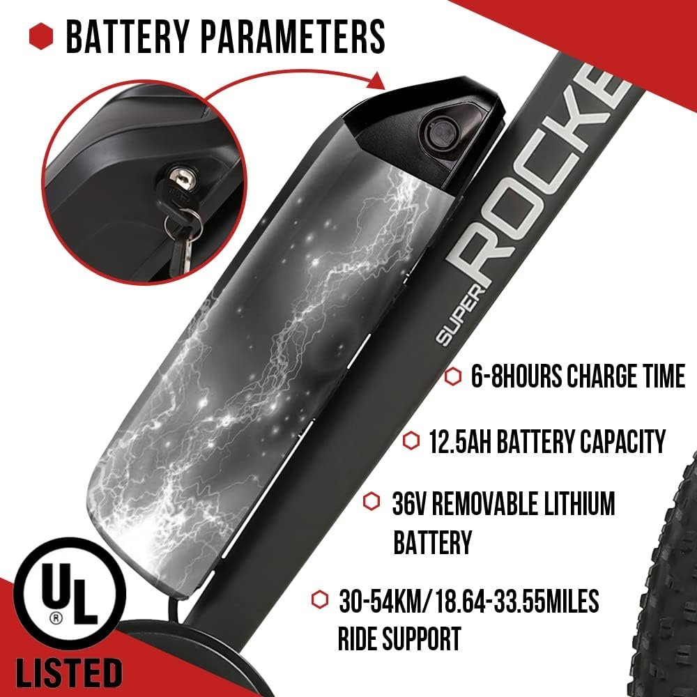 STRONG 500W GEAR MOTOR- Powerful mountain e-bike with 500W rear motor, providing strong driving force. This rocket electric bike is designed for off-road cycling and weekend adventurers. Whether you’re camping, hunting, fishing, or cycling long distances on rugged trails or mountain roads, it can help anyone who wants to get on the road, no matter your physical ability. The default factory maximum speed:23.6 Mph. (If you need higher speed, please adjust according to the instruction.)