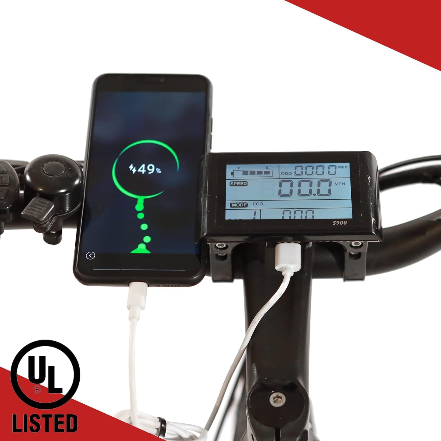 COMFORTABLE ADVENTURE CYCLING EXPERIENCE- Lightweight but strong enough aluminum alloy frame, coupled with suspension front fork to effectively absorb vibration. 26*4.0 ” puncture avoidant tires are enough to help you conquer any tough road conditions, whether mountain, snow, beach. It is equipped with an S900 LCD display, which can display cycling data and charge mobile phones. SHIMANO 7 speed drive system