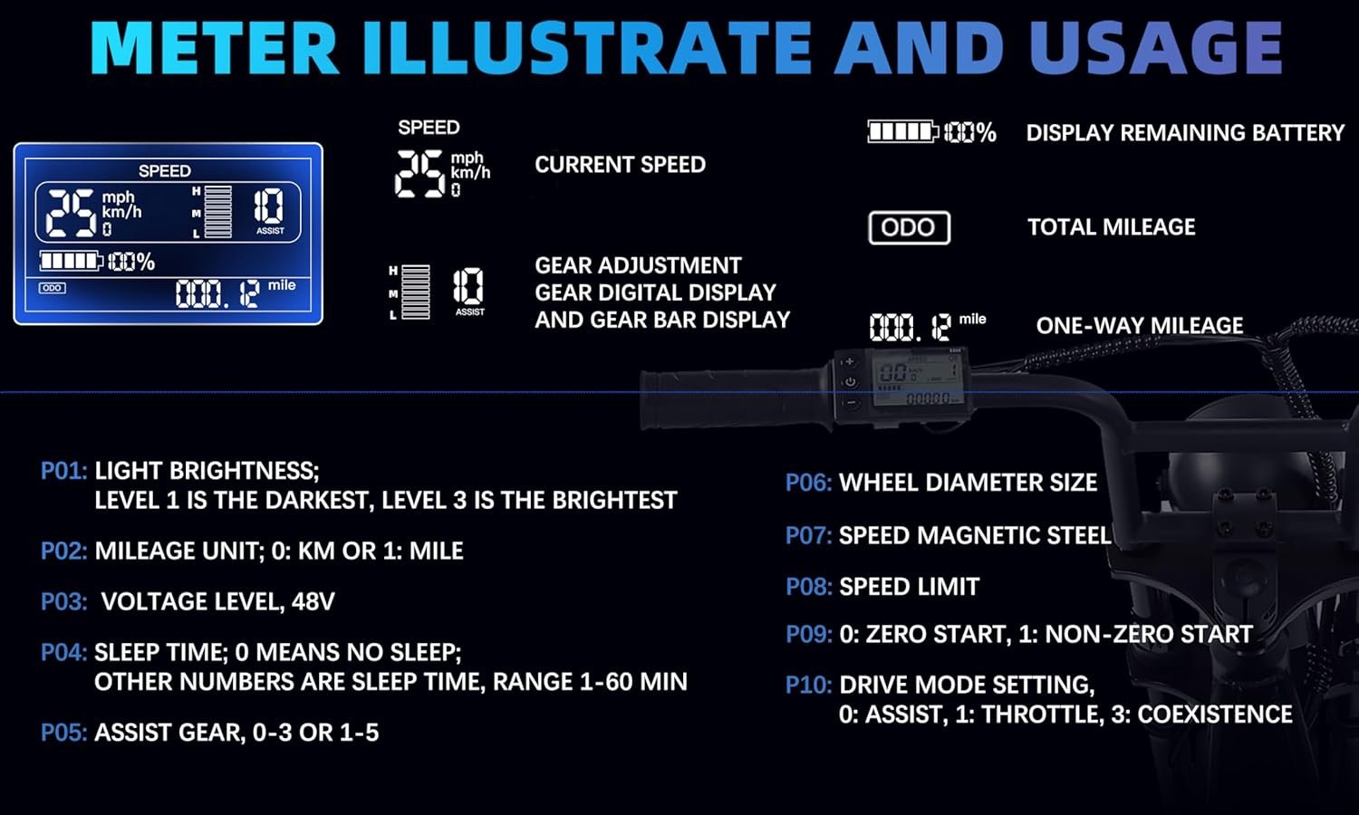 【4 Riding Modes And 5 Pedal-Assist Levels】 E-bike offers 4 riding modes: 1. Pure Electric Mode: Just turn the throttle to power the adult electric bike motor, in this mode, it has a 25 Mile battery range. 2. Pedal-assist Mode: When you pedal, the motor provides ebikes with power, and it has a 27-37 Miles battery range. 3. Classic Bike Mode: Like any bicycle. 4. 3.8 miles in help promote mode. The intelligent LCD 5-level display panel allows you to select the desired level of electric assistance.