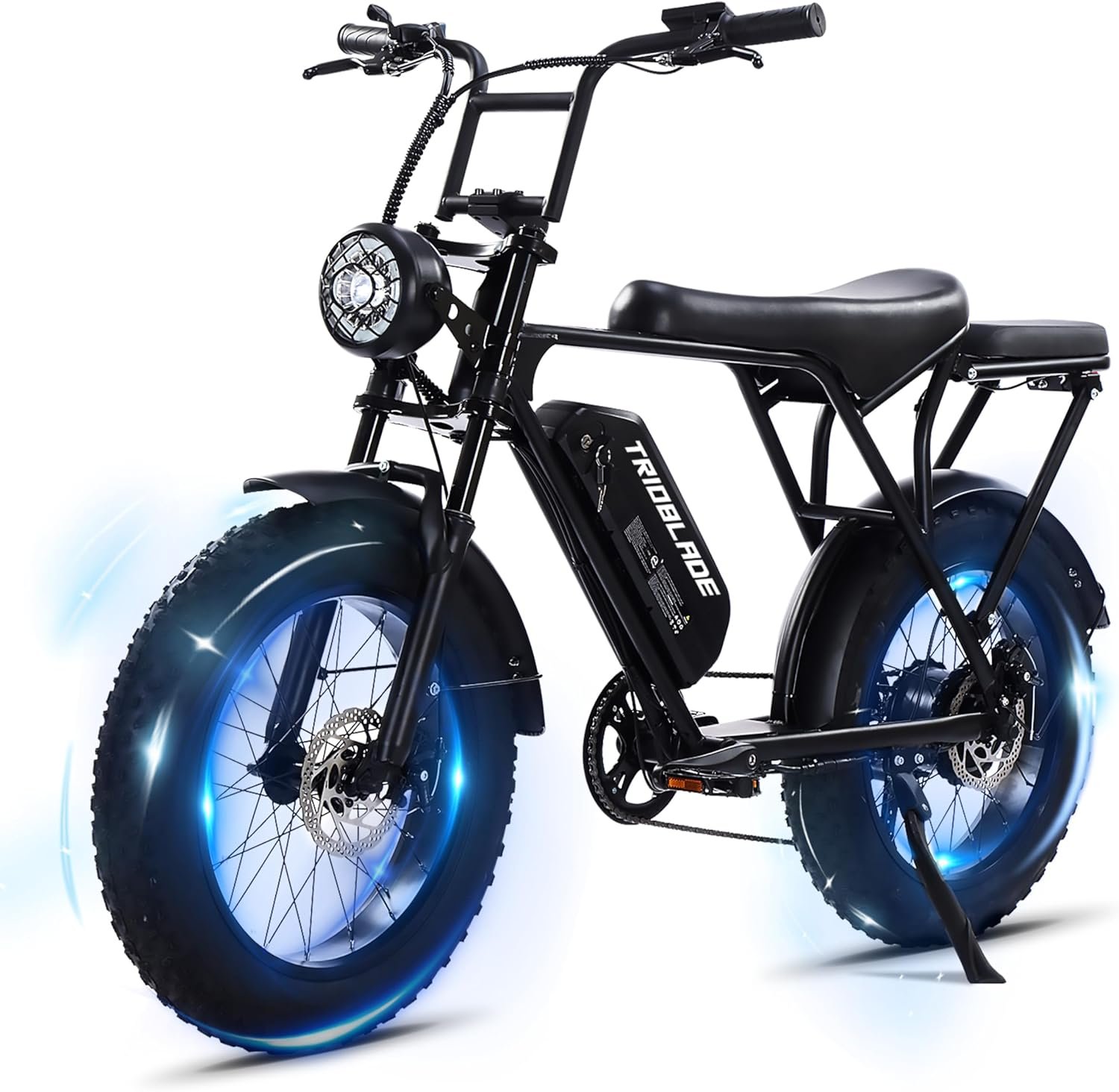【VINTAGE INSPIRED DESIGN】TRIOBLADE E bike for adults, combining classic aesthetics and modern technology. The durable frame ensures lightweight performance and long-lasting durability, while the matte finish adds a touch of luxury, both stylish and retro. Electric Motorcycle with sleek lines, sharp LED headlights, and a commanding front face, this dirt bike exudes confidence. E bike for adults wide body and sturdy chassis provide exceptional stability on any terrain. Turn heads wherever you go.