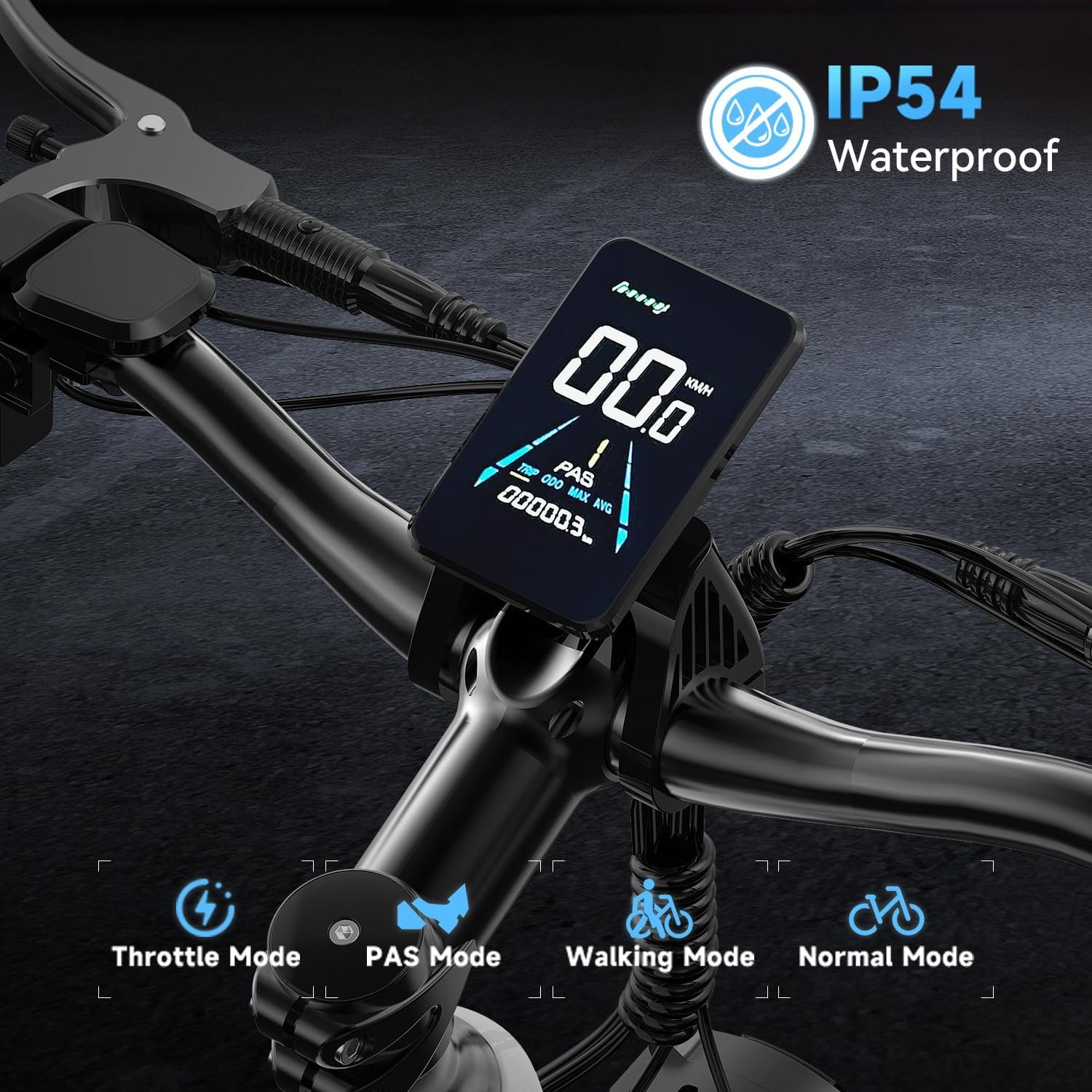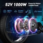 🚲 【Powerful Brushless Motors】 Equipped with 1000W Motor(Peak 1600W) , this electric bike delivers exceptional power and torque for conquering hills and off-road terrain. It can reach top speeds of around 32-35 MPH. The motors provide strong 90Nm of torque, enabling rapid acceleration and enhanced load capacity for carrying cargo or heavier riders.