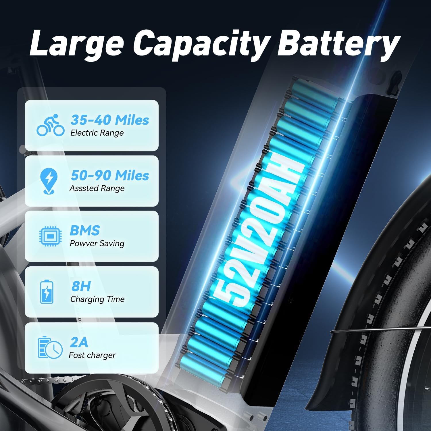 🚲 【Removable Large Battery】 Powered by a high-capacity 52V 20Ah lithium-ion battery, this e-bike offers an impressive range of up to 35-90 miles on a single charge. Riders can cover more distance without frequent recharging. The battery is lockable, removable, and easy to carry for charging at home or work.