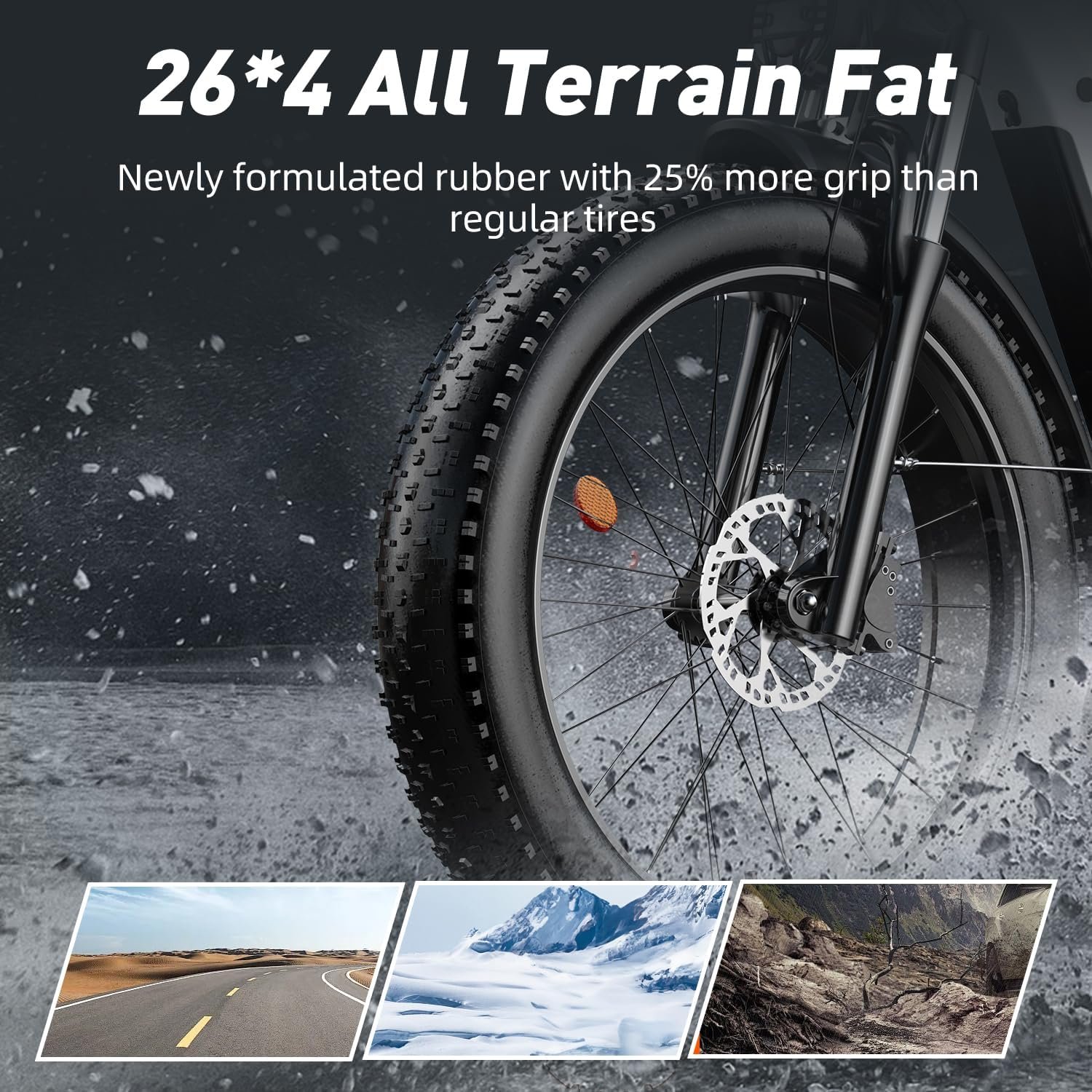 🚲 【All-Terrain Fat Tires】 Designed with 26×4.0 inch fat tires, these provide a larger contact patch with the ground, offering superior grip and traction. This is especially beneficial on off-road or slippery surfaces where extra traction is crucial, making riding safer and more comfortable on uneven or loose terrain such as sand, snow, mountains, or gravel.