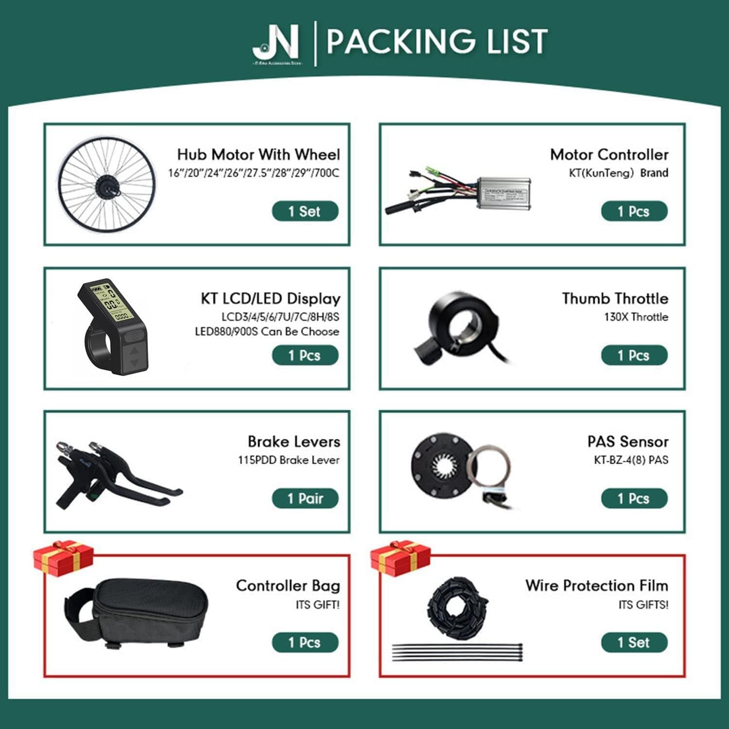 【PACKAGE CONTENTS】: The electric bike conversion kit includes all components needed for installation; hub motor, controller, display, accelerator, brake lever, pedal assist system, torque arm and cable ties, etc. We’ll give you the controller pack for free! We put the installation instructions inside the package. (Note: Batteries not included)