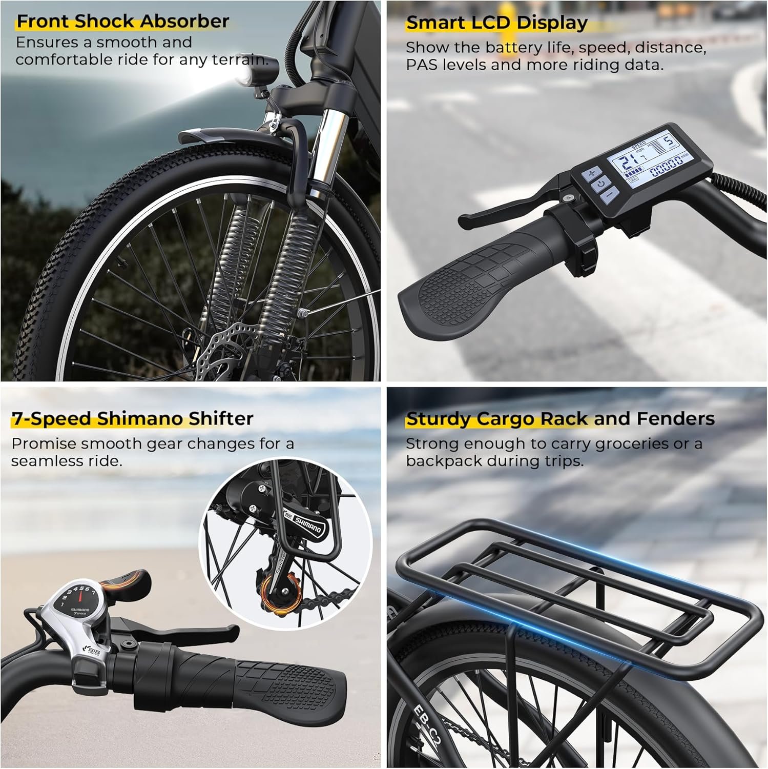 SAFE EBIKE CONFIGURATION: 26 inch adult electric bicycle utilizes 7-speed system, promising you precise gear shifting for a smooth and efficient ride. The front suspension fork helps smooth out the bumps on rough surfaces, while the dual disc brakes deliver reliable stopping power. The LCD screen keeps you updated on battery life, speed, distance, PAS level and more. Thoughtful e bike accessories like headlight, electric horn and reflectors make you safe and secure during nighttime rides.