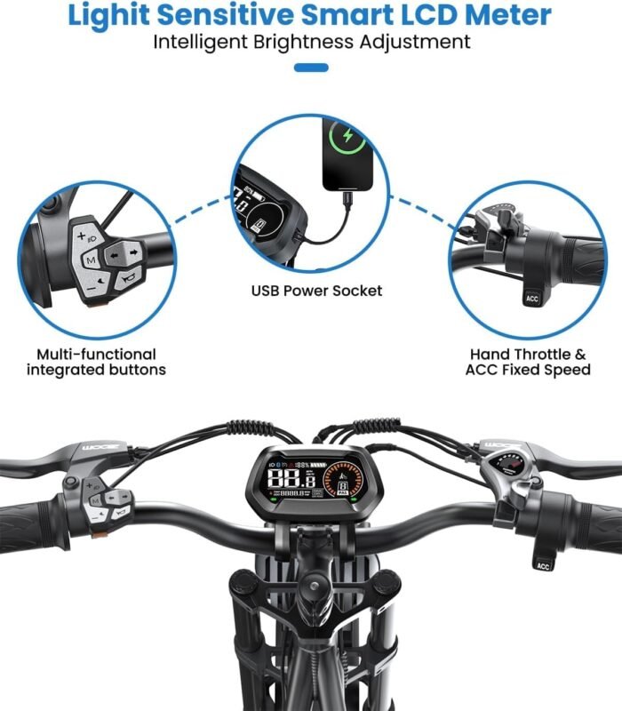 3 Modes/LED Display: The All Terrain E-Bike offers three useful riding modes- electric mode, pedal assist mode and classic bike mode, so you can choose your favourite mode according to your needs. and the LED smart LCD display ensures that you are always aware of real-time data such as speed, battery level, pedal assist level, mileage and other relevant information. You can easily keep track of your ride and enjoy an exciting cruise or adventure anytime, anywhere