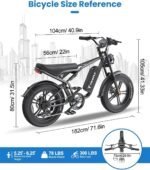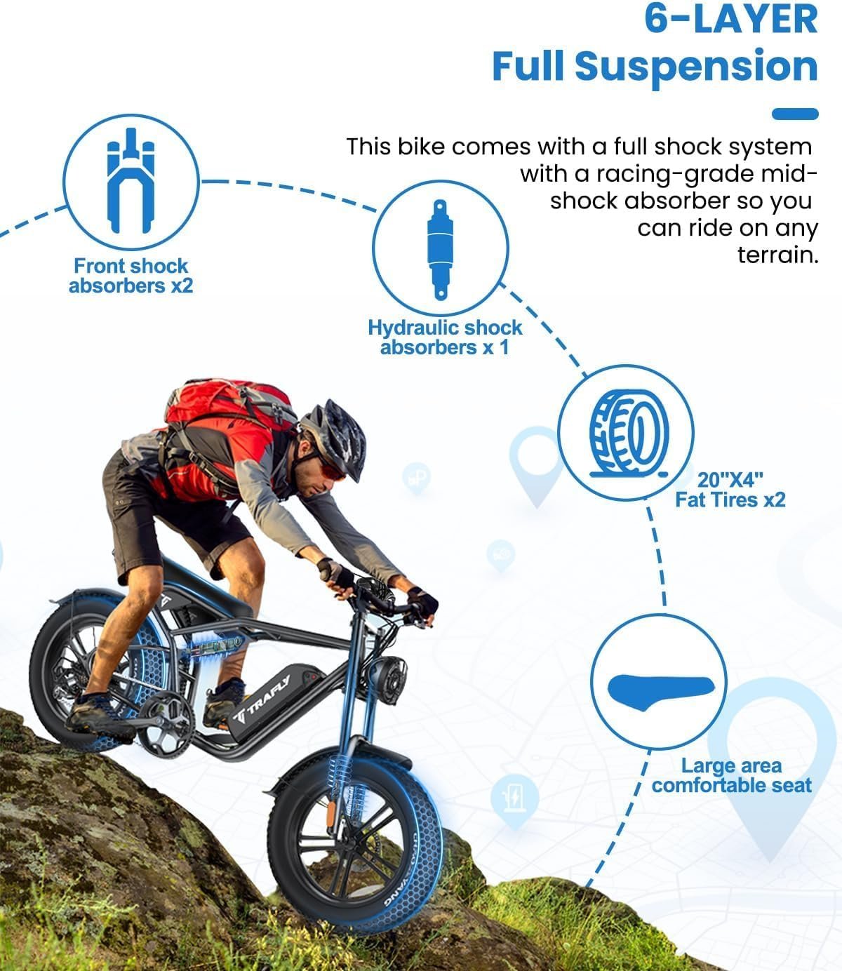 Stability & Durability: Boasting a 6-speed full suspension, dual disc brakes, fork spring dampers, seat spring dampers, and non-slip, durable 20″X4″ fat tires, the e-bike designed for various terrains ensures excellent grip and superior shock absorption. It is equipped with front and rear mechanical disc brakes, as well as the EABS system, allowing riders to enjoy a smooth ride and reliable stopping power, even when traversing challenging roads or tackling steep hills
