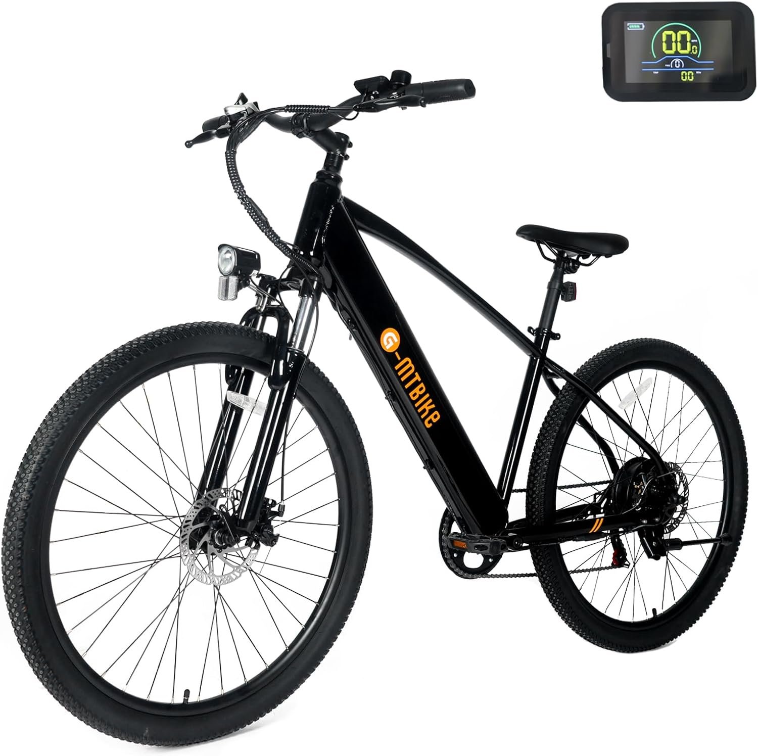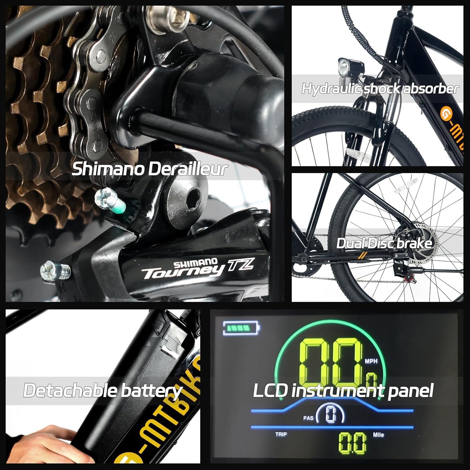 [Stylish Appearance and Lightweight Design] This mountain electric bicycle is constructed from lightweight carbon steel, making it easy to handle and perfect for commuting or leisure rides. Its built-in battery offers a sleek aesthetic while enhancing safety. The front fork’s shock absorption system ensures a smooth ride over bumps, and the front and rear LED lights enhance visibility in low-light conditions.