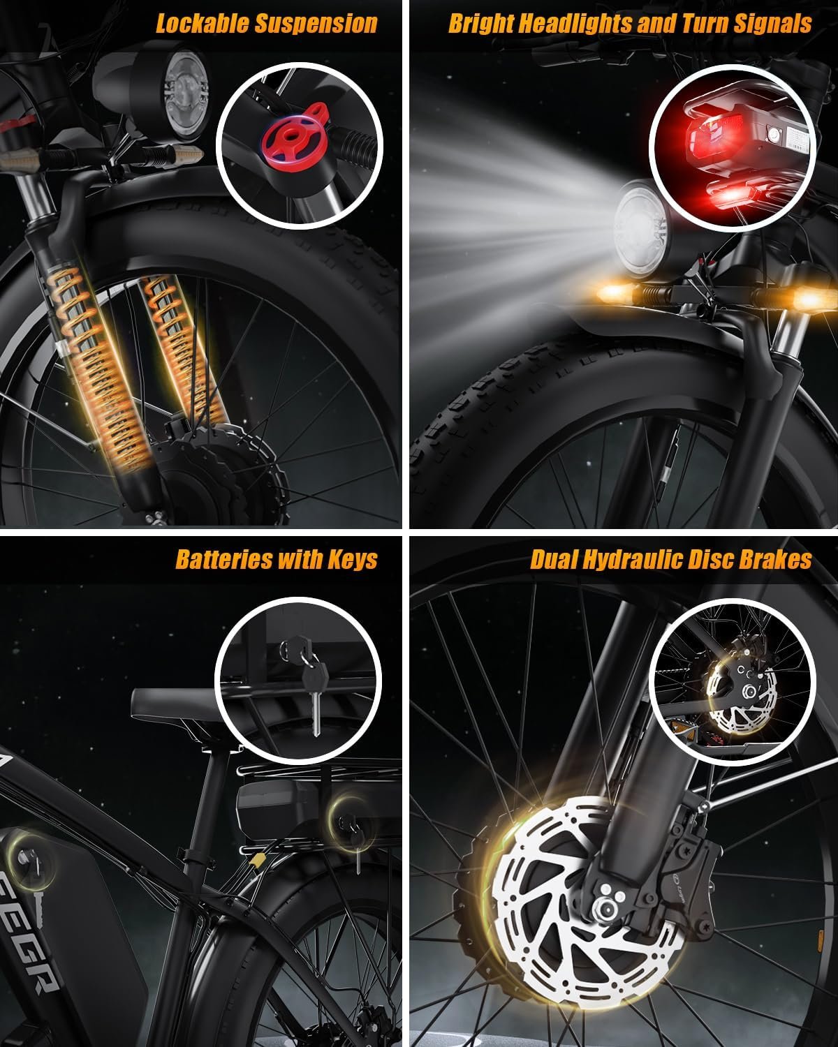 【Anti-slip and Wear-resistant Tires】:26″ fat tire electric dirt bike can confront any surfaces with confidence, unparalleled stability and traction whether it’s cruising along sandy beaches, navigating rocky trails, or conquering urban streets and tackle any challenge, making your e-bike adapted to complex terrains and keep you safe. Fat tires are more anti-slip and wear-resistant than small thin tires.