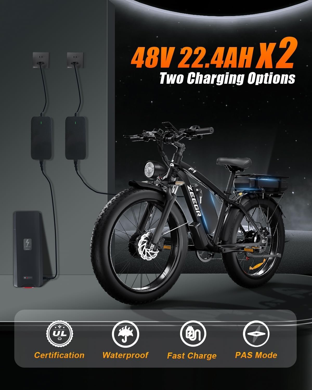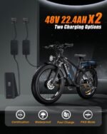 【Removable Large Capacity Battery×2】Dual batteries 48V 22.4Ah ,this fat tire electric bike supports a longer range up to 70-120 miles in pedal assist mode. Upgraded 54.6V 3A charger completes charging quickly in 5-8 hours,so that it can meet travel or daily commute needs.