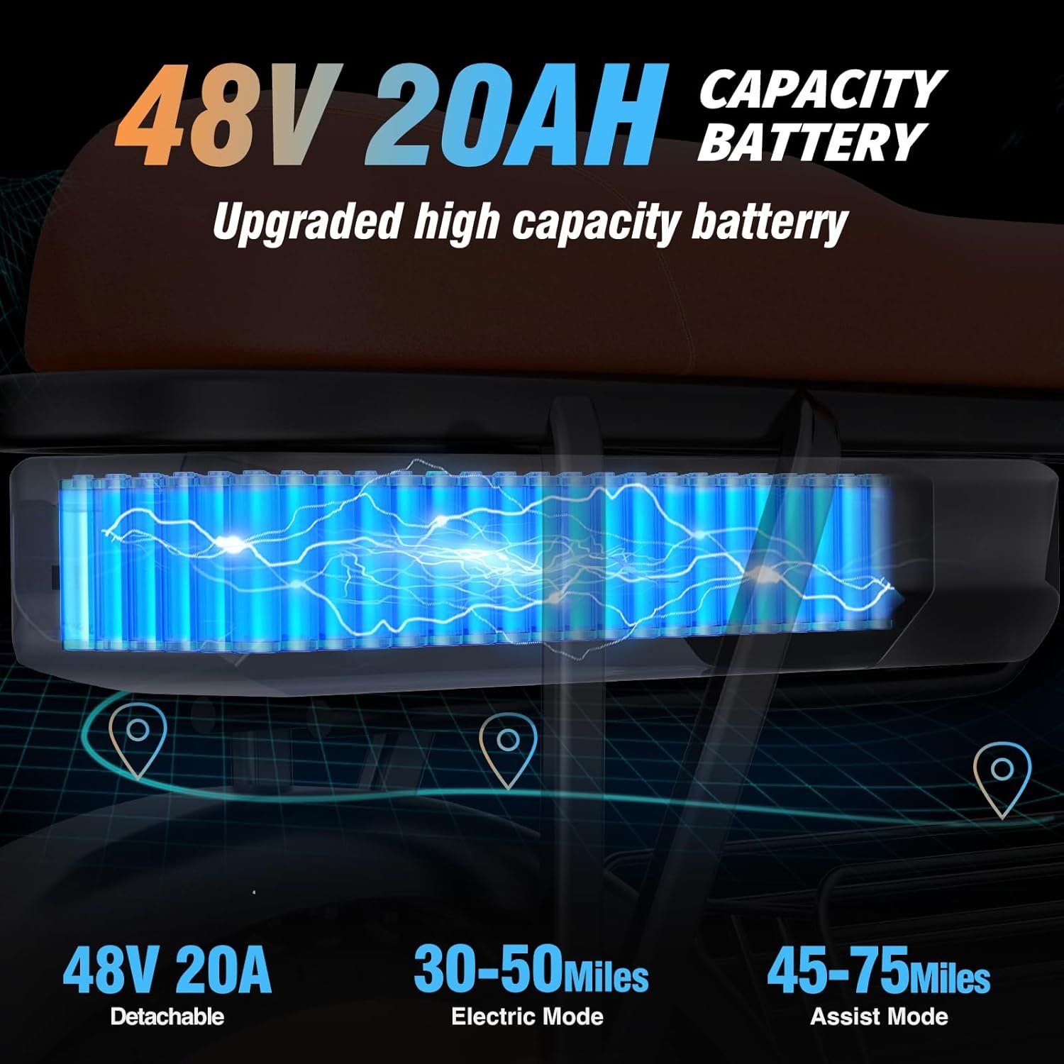 【𝐈𝐦𝐩𝐫𝐞𝐬𝐬𝐢𝐯𝐞 𝟕𝟓 𝐌𝐢𝐥𝐞 𝐑𝐚𝐧𝐠𝐞】Achieve up to 40 miles per charge in electric-only mode and an impressive 75 miles in pedal-assist mode (PAS 1 mode). The detachable 20AH upgraded battery (UL certified) charges in just 4-6 hours and boasts an IP54 waterproof rating for added durability