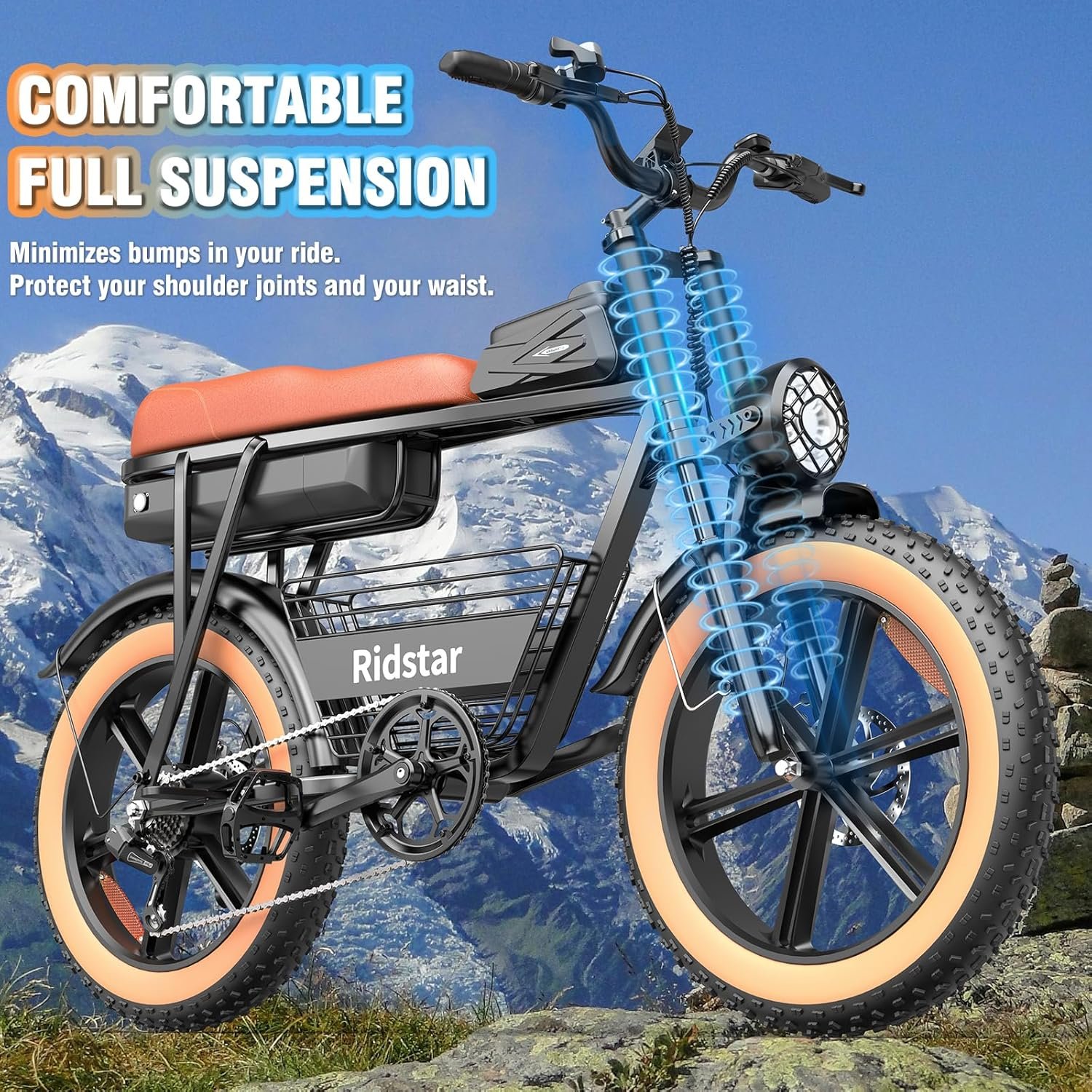 【𝐅𝐮𝐥𝐥 𝐒𝐮𝐬𝐩𝐞𝐧𝐬𝐢𝐨𝐧 & 𝐇𝐲𝐝𝐫𝐚𝐮𝐥𝐢𝐜 𝐃𝐮𝐚𝐥 𝐁𝐫𝐚𝐤𝐞𝐬】Smooth ride with 5-level suspension & dual disc brakes. Strong front fork shock absorbers, seat shock absorber, and puncture-resistant 20″X4″ fat tires. Reliable braking on steep slopes & rugged terrain with front disc brakes, rear hydraulic shock absorber, and EABS system. Hydraulic dual brakes reduce braking distance by 50% in wet conditions