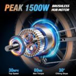 【𝐏𝐞𝐚𝐤 𝟏𝟓𝟎𝟎 𝐖 𝐁𝐫𝐮𝐬𝐡𝐥𝐞𝐬𝐬 𝐇𝐮𝐛 𝐌𝐨𝐭𝐨𝐫】The peak 1500 W brushless hub motor offers enhanced climbing ability, reaching speeds of up to 30 mph in pure electric mode, effortlessly conquering gradients of up to 40 degrees. The 7-speed gear system caters to all your riding and training needs