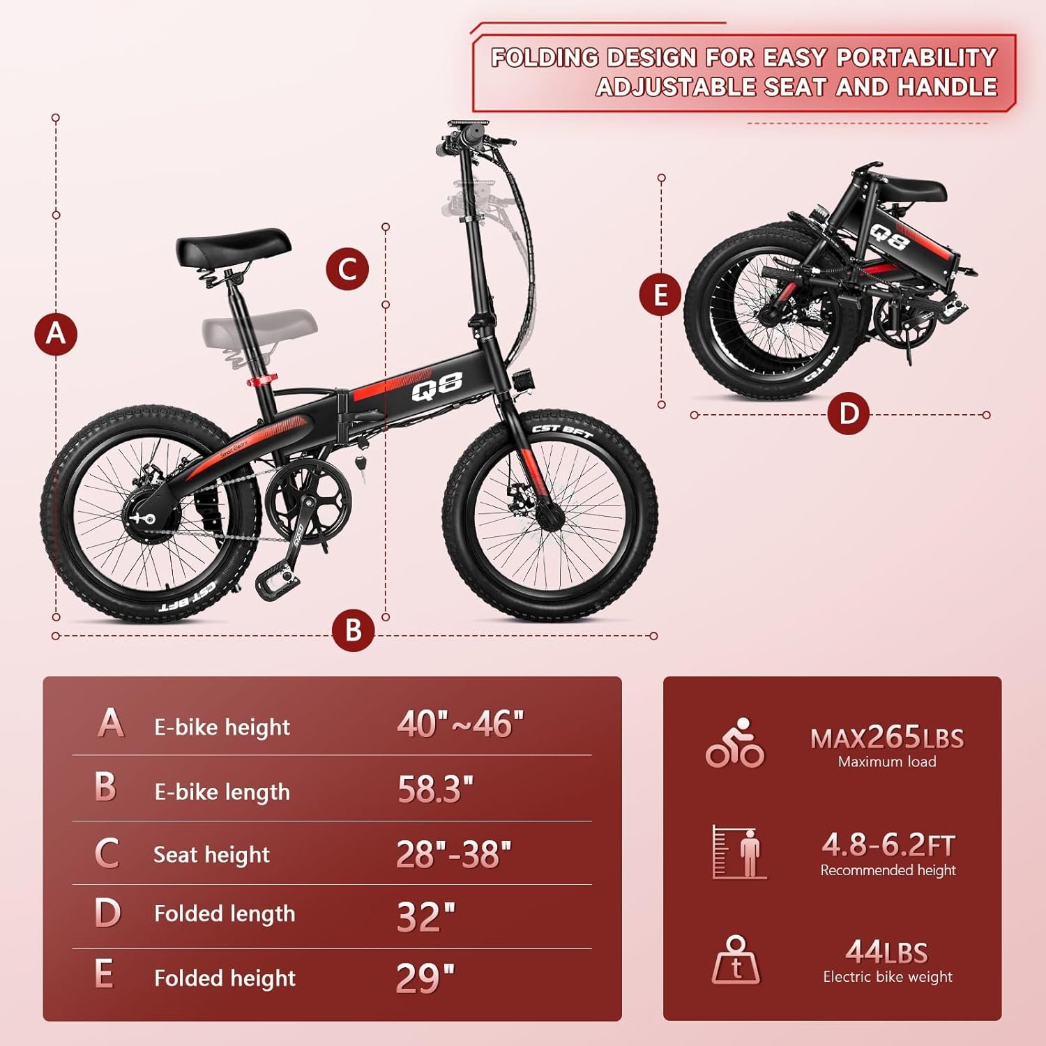 【Adjustable & Portable Design】Aluminum alloy frame, Weight 53 LBS. Ebike is easy to handle. The adjustable seat fits from 4’8″ to 6’2″. Comfort for men, women, seniors, office workers, retirees, and students. It folds easily in a car trunk, saving space, and is suitable for commuting, traveling, or outdoor adventures.