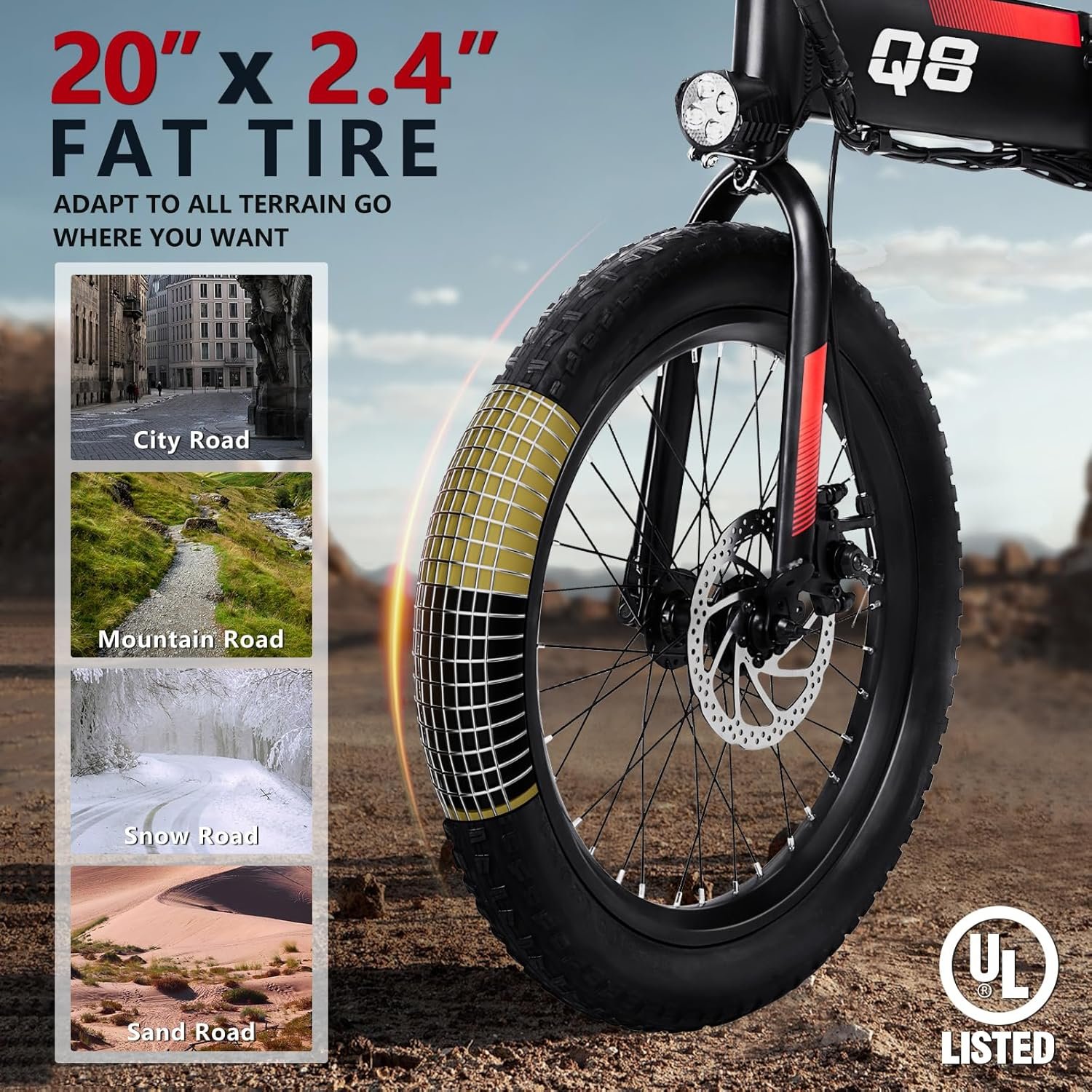 【LCD Display & Tips】The LCD shows speed, mileage, battery level, etc. The 20-inch fat tires provide grip and stability on various terrains. The battery indicator has five grids, each grid 20%. Keep the battery charged above 20% when not in use.