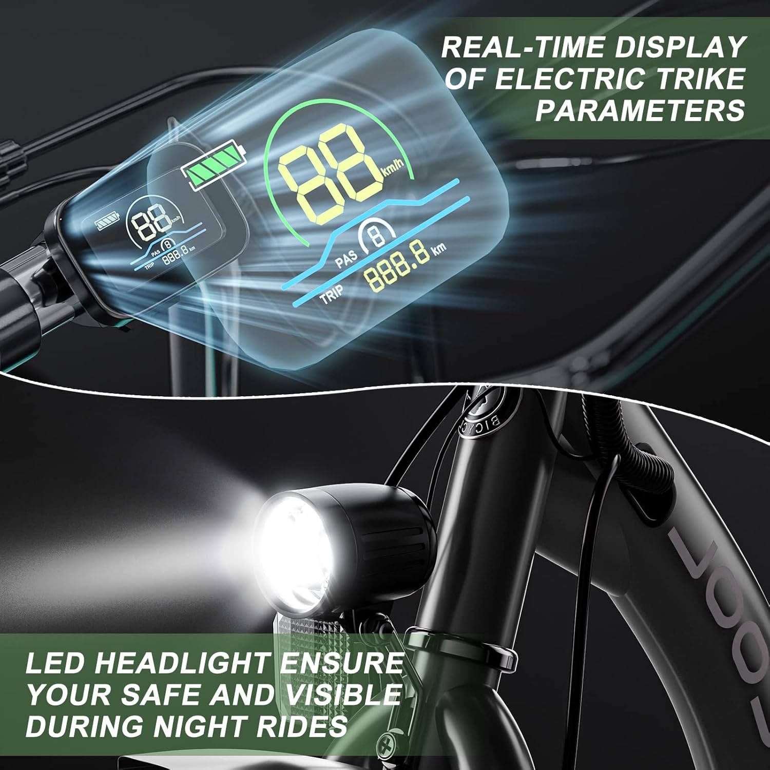 ❤ 7-Speed Derailleur:7-speed grip-twist shifters and the derailleur provide a wide gear range and smooth shifting, various speeds are suitable for different slopes and road conditions. The maximum speed of the 3 wheel electric bicycle can extend 16 miles/h.