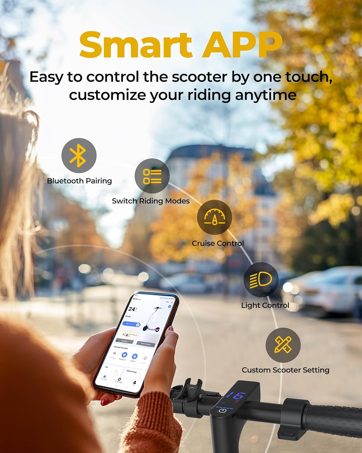 ⭐Smart App Control: the electric scooter is equipped with an intelligent control system. It can realize locking, riding mode, lighting system, speed level, cruise control, start mode and scooter status display, etc. One-stop solution, comprehensive control, bringing more convenience to your riding