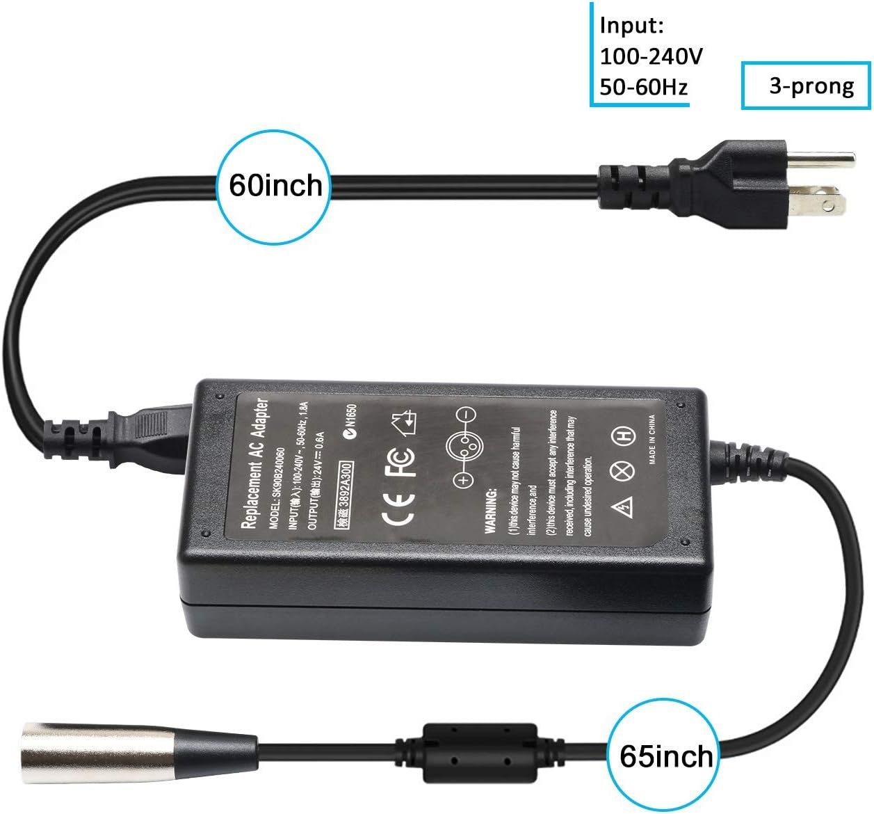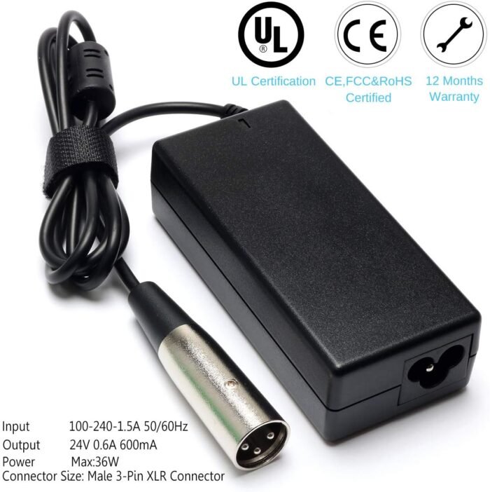 Product DetailsOutput: 36W 24V 0.6A 600mAInput: 100 – 240V 50-60Hz Interface: Male 3-Pin XLR Connector (please check it)Compatible ModelseZIP Electric Bike Motor Bicycle scooter Partsezip trailz bike 300 Electric ScootereZIP 400 (e400 & 400NS) Electric ScootereZIP 500 E-500 (e500) Electric ScootereZIP 750 (e-750) Electric ScootereZIP E-450 (E450) Electric ScootereZIP 650 (E650) Electric ScootereZIP 900 (e900) Electric ScootereZip 4.0 Electric ScootereZip 4.5 Electric ScootereZIP E-4.5 Electric ScootereZip Electric Trailz BikeEzip Mountain Trailz Schwinn 4.0 S180, S200, S300, S400, S500, S750 Jazzy Power ChairGo-Go Elite Traveller (Plus HD) Electric ScooterMerits S-132 ScooterHoveround MPV5 Power ChairMerits P320 WheelchairRascal 320 WheelchairPride Jet 3 Ultra Indoor Power WheelchairPride Jazzy 614HD WheelchairPackage Content1x Ac Adapter/Battery Cable Charger1x Ac Power Cord/Cable