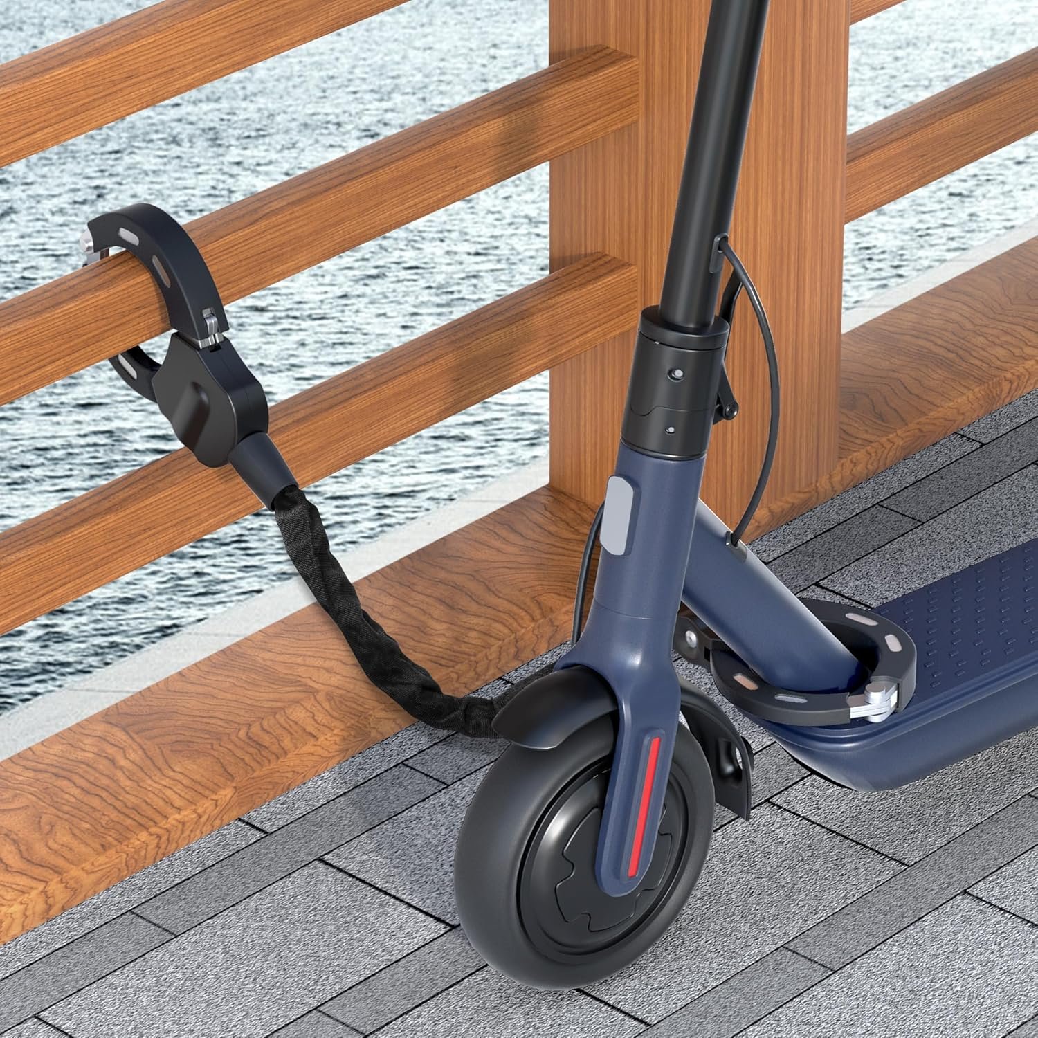 Stronger and Longer Chain: The chain diameter is 0.25 inch, length is 36 inch. The lock head has three adjustable sizes, 2.95, 3.15, 3.35 inch. It is stronger, and the longer chain can be more flexible to lock the scooter
