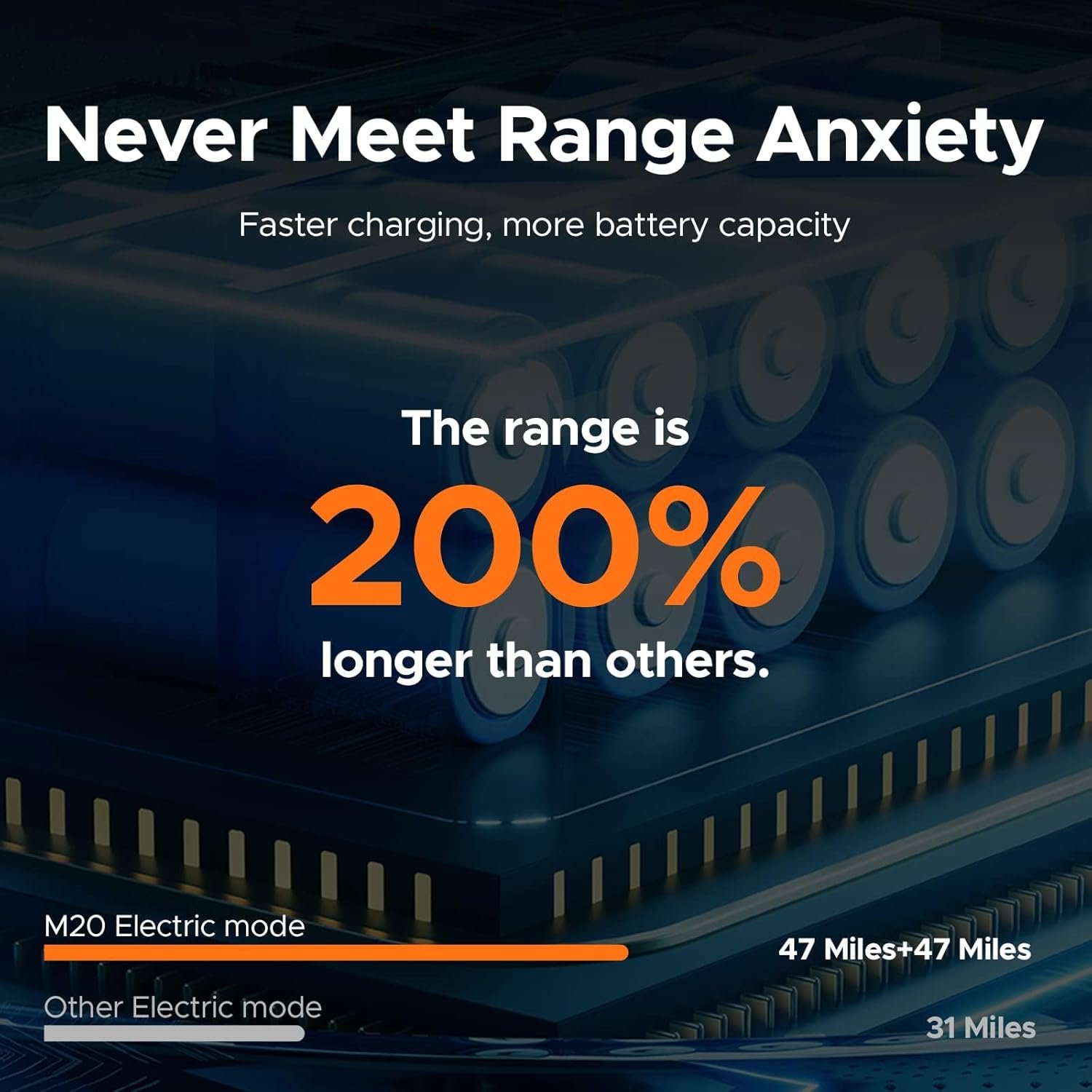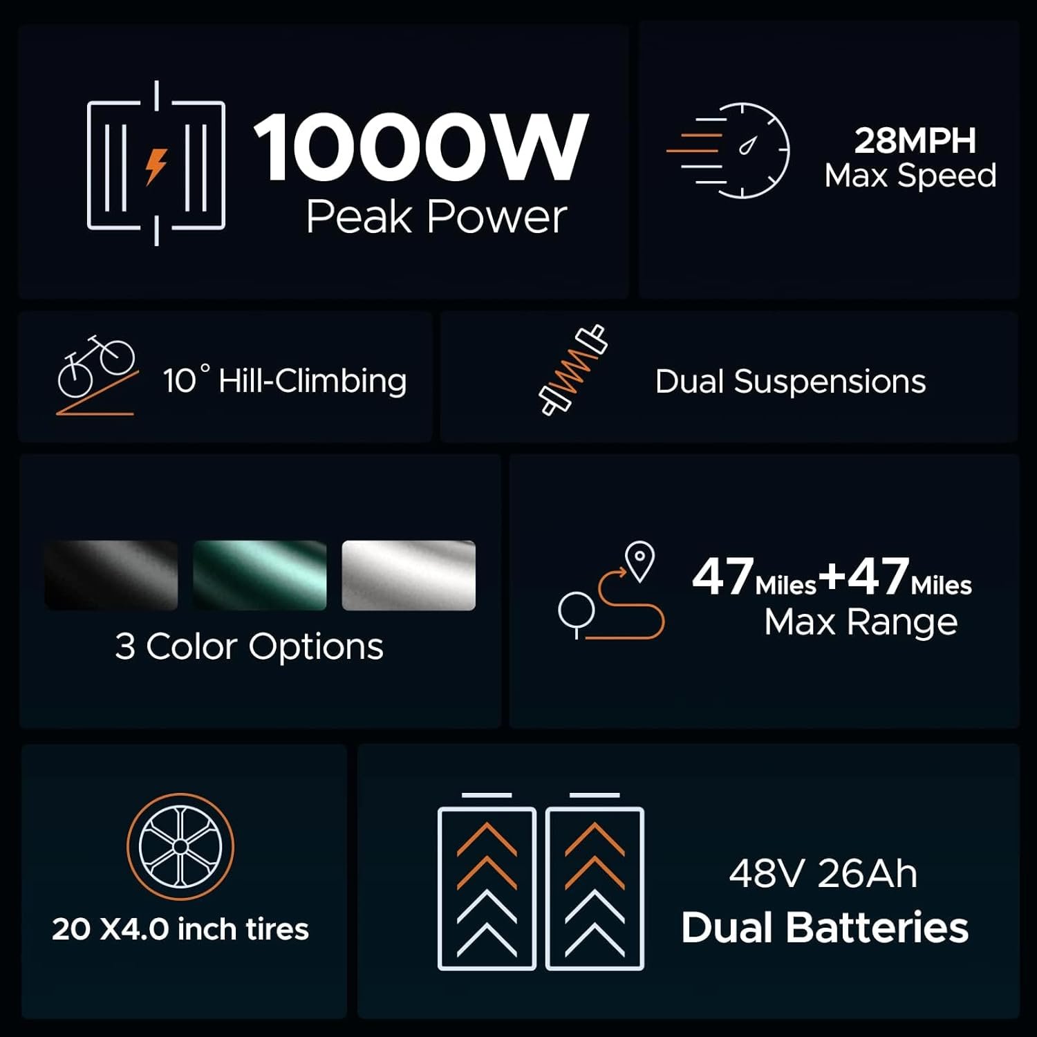 【Extended Range up to 94 Miles with 48V 26A Dual Battery】 The dual-battery version offers a maximum range of up to 94 miles. In pure electric mode, travel up to 34.17 miles, or switch to assist mode for up to 47 miles. For the ultimate long-range experience, achieve up to 68 miles on a single charge, perfect for long rides on your cruiser or mountain ebike.