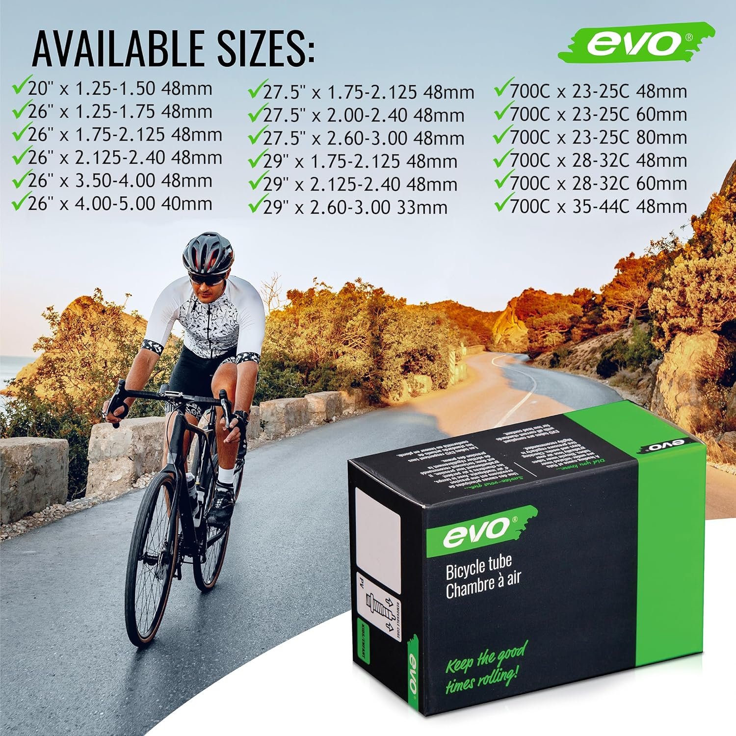 EVO Presta Bicycle Inner Tube, 20″, 26″, 27.5″, 29″, 700C, Road, Mountain, Gravel Bicycle, Presta Valve Stem